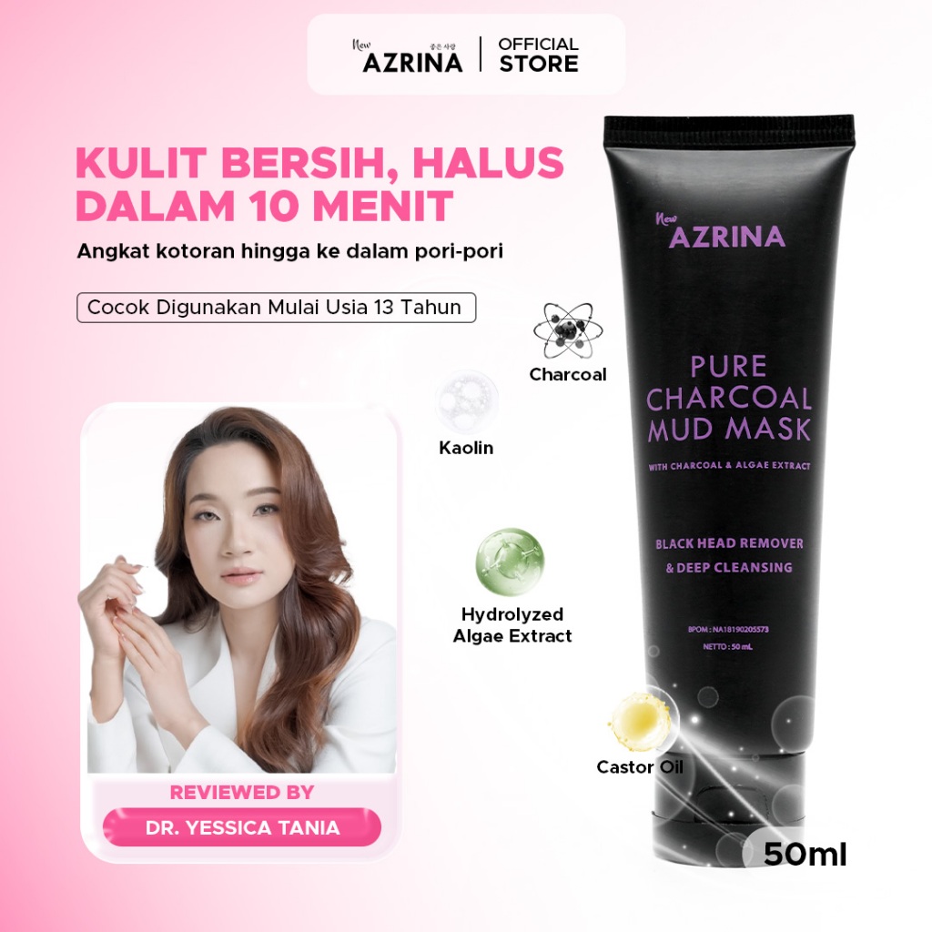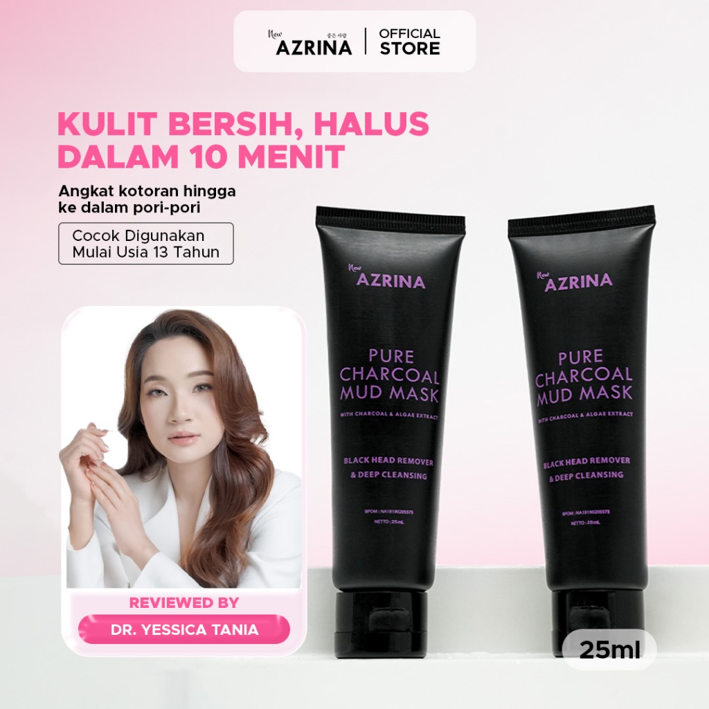 Azrina Pure Charcoal Mud Mask 25ml / 50ml | Clay Mask Komedo, Brightening, Pori-Pori & Wajah Kusam