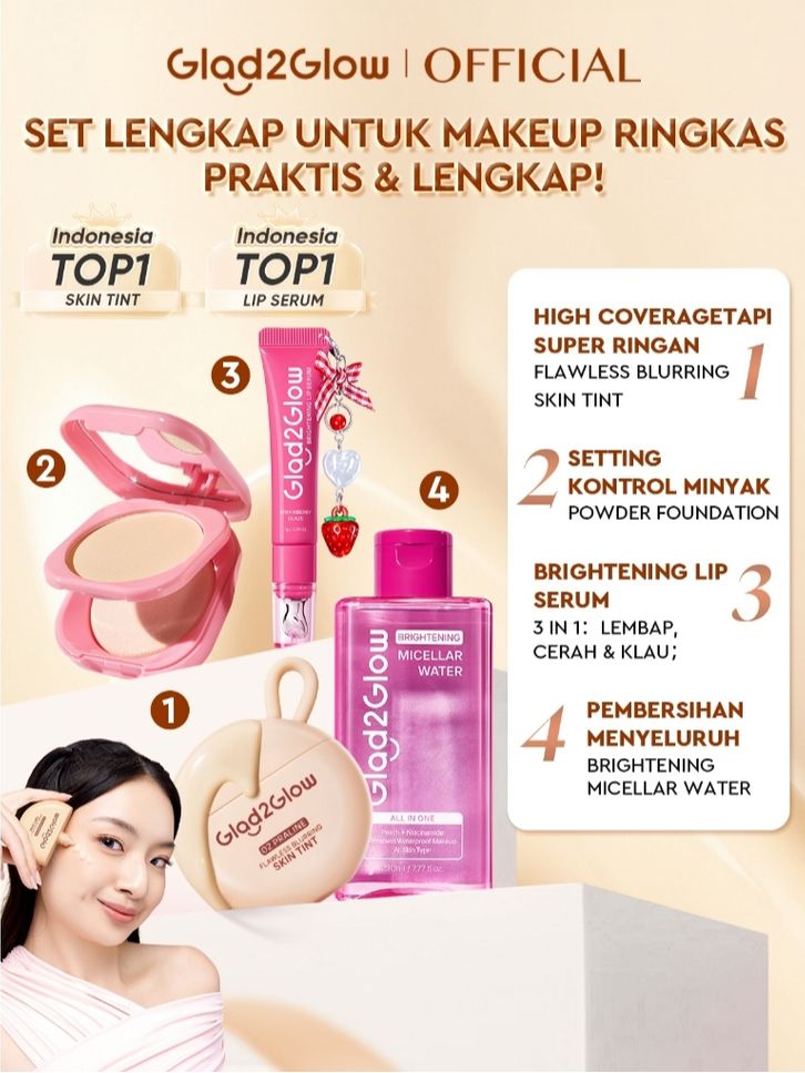 Makeup Glad2Glow 4in1 Flawless Blurring Skin TIint + Brightening Lip Serum 7g + liptint + Micellar Water