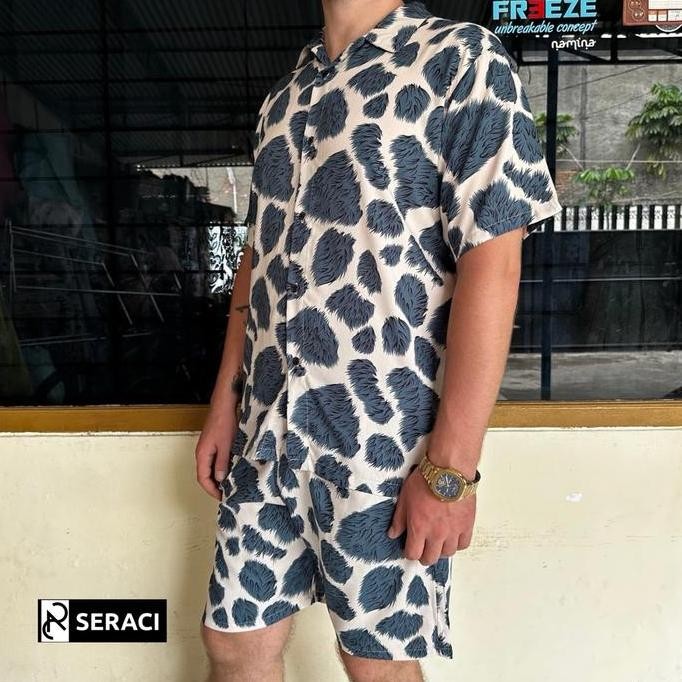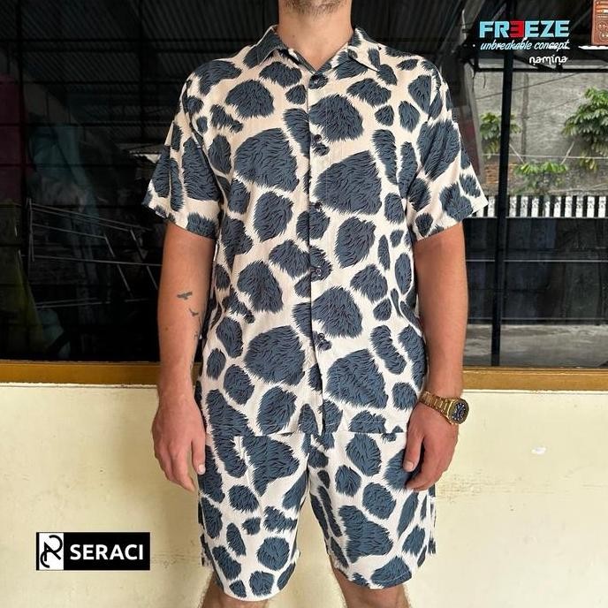 SERACI - one set kemeja pria dan wanita setelan celana pendek hawaii daily outfit pantai bahan rayon premium baju tidur piyama motif Monster Denim