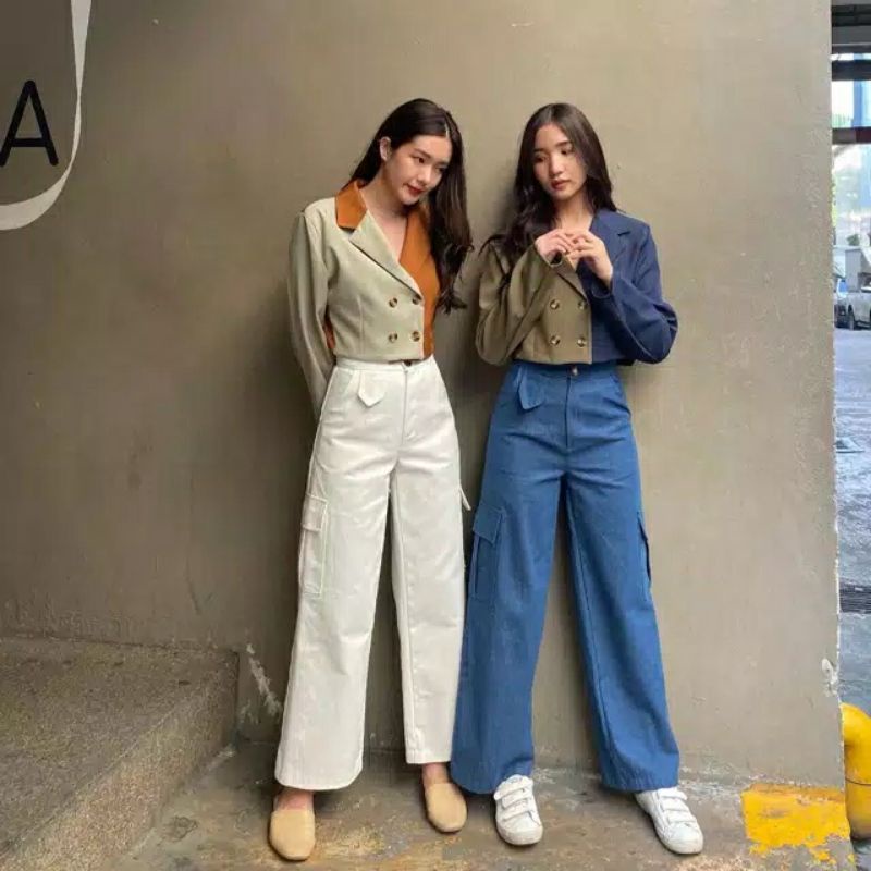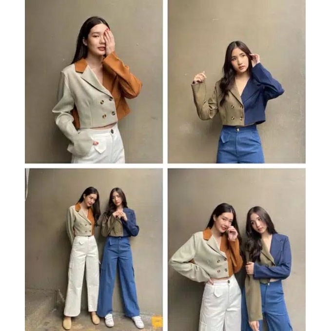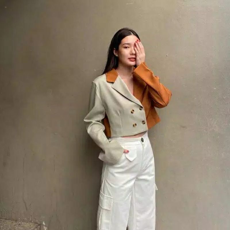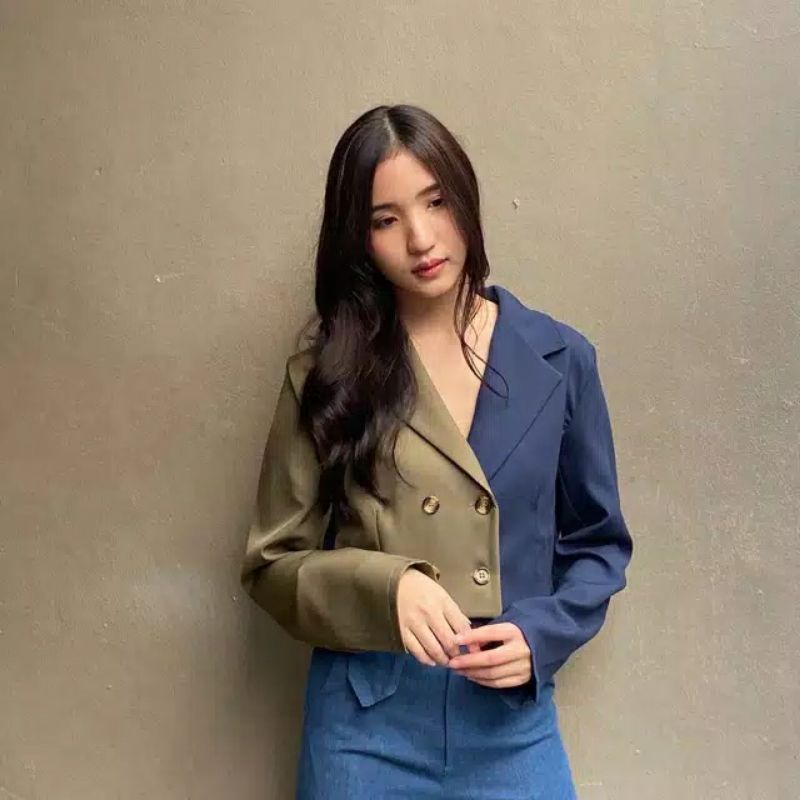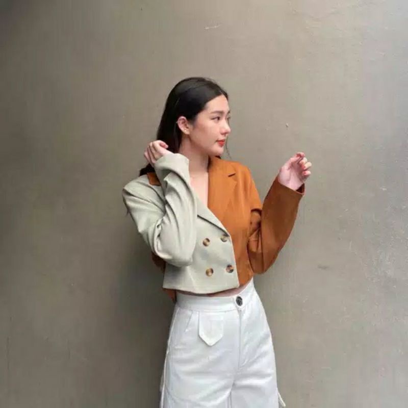 Kurobo - Two Tone Blazer Crop | Blazer Wanita Crop Trendy Dua Warna Kombinasi | Outerwear Fashion Korea Modern
