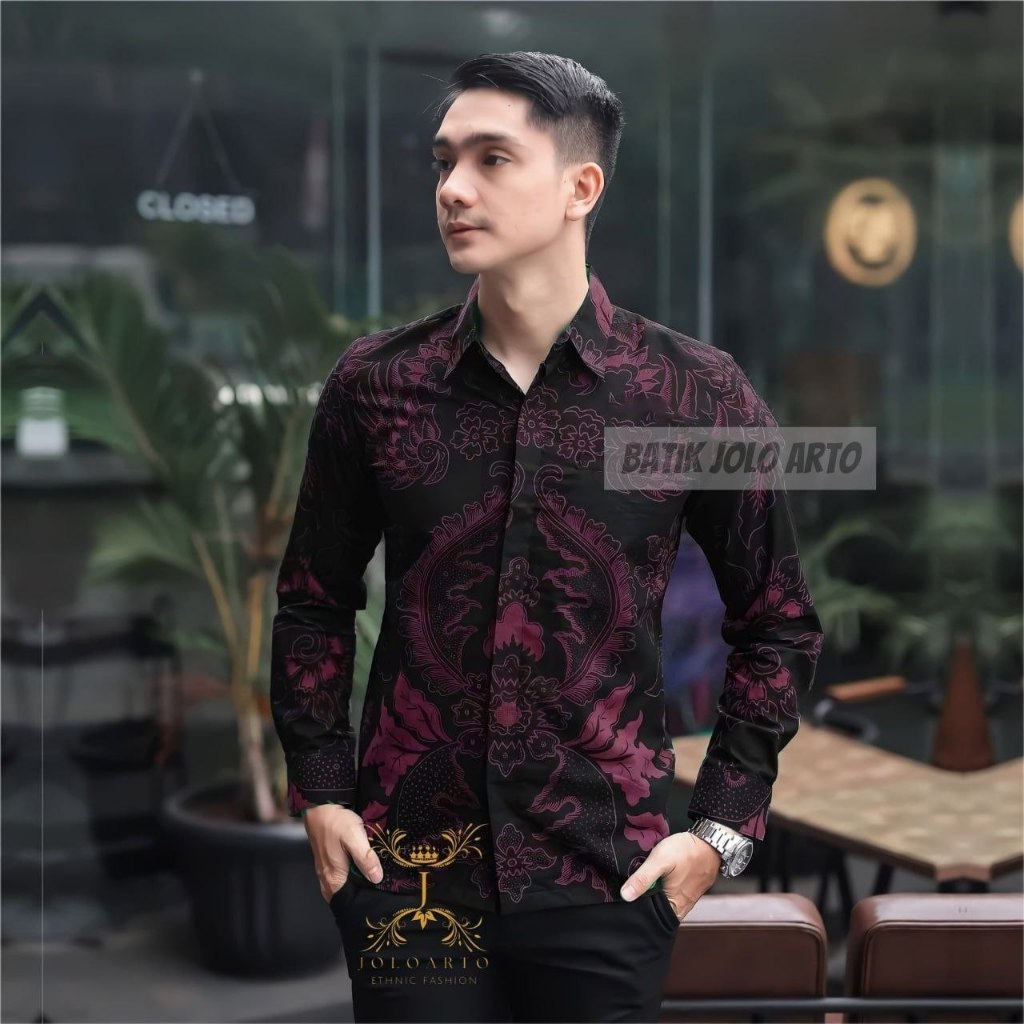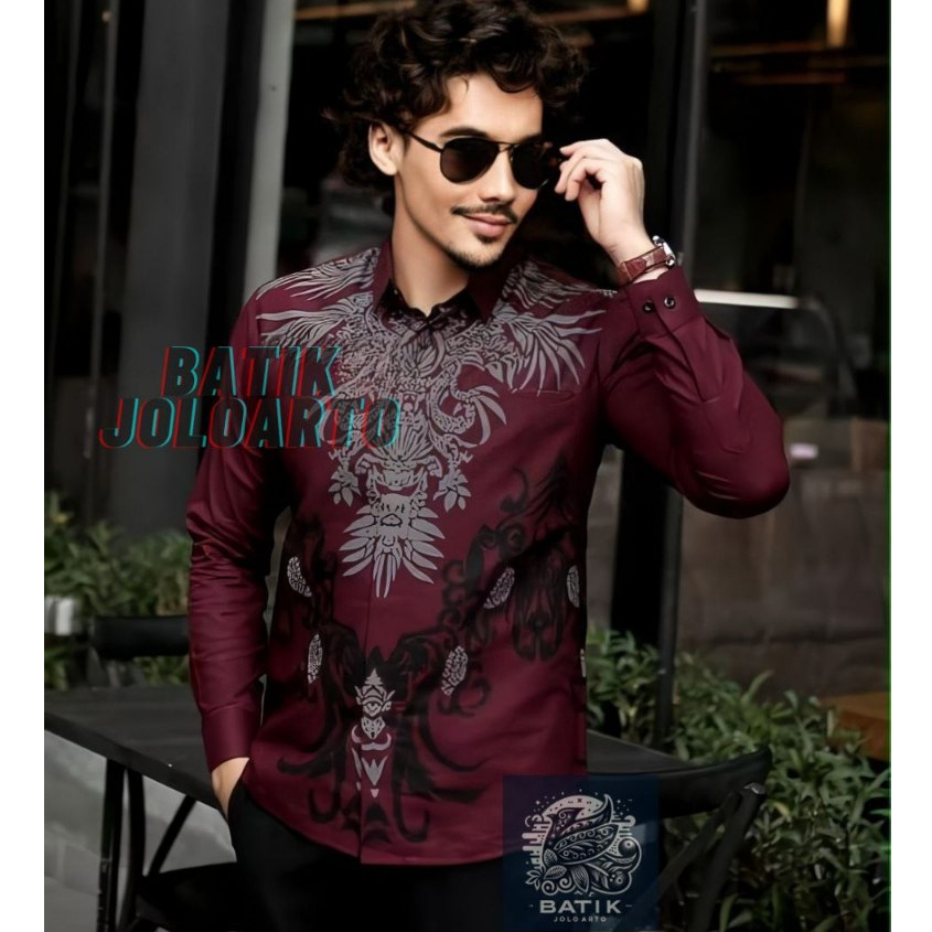 BATIK JOLOARTO Motif BIMANTARA BURGUNDY Kemeja Batik Pria Lengan Panjang Modern Batik Kantor Pria