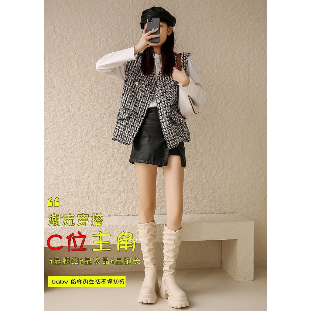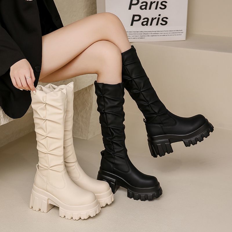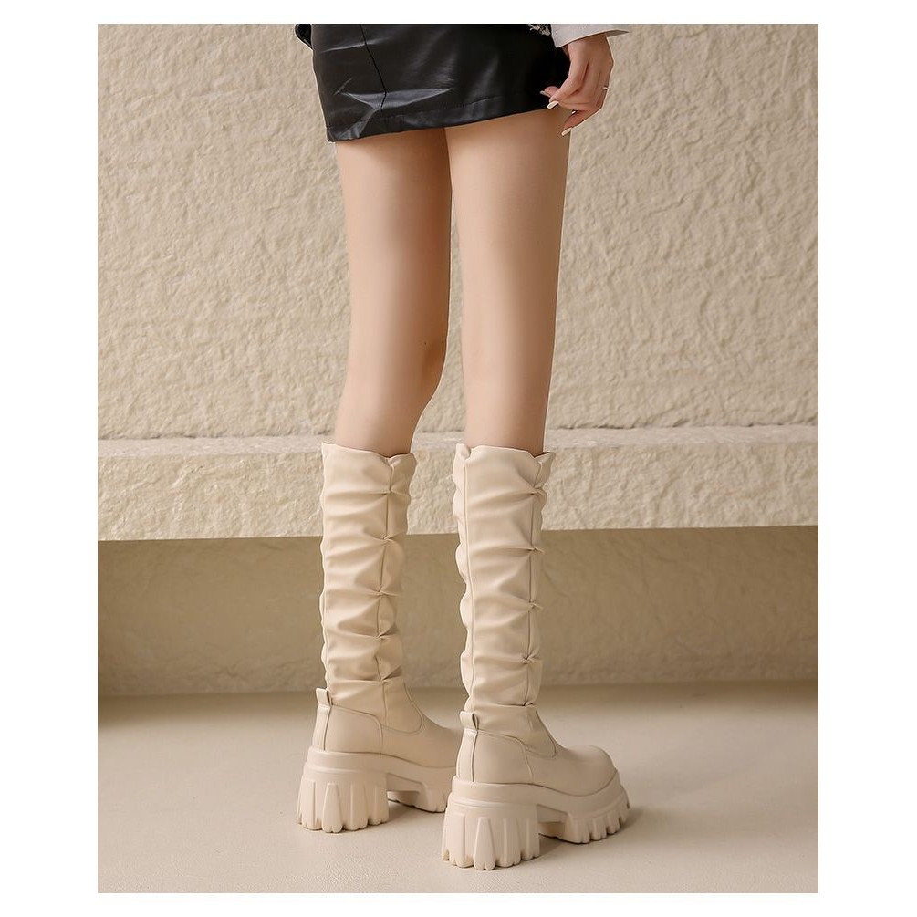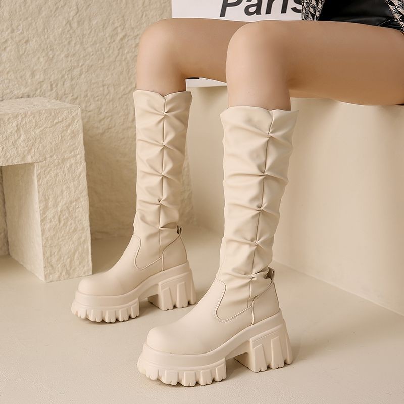 Women's Chunky Heel Retro Warm Cotton Boots Pleated Pile Style Boots below the Knee Thin Boots