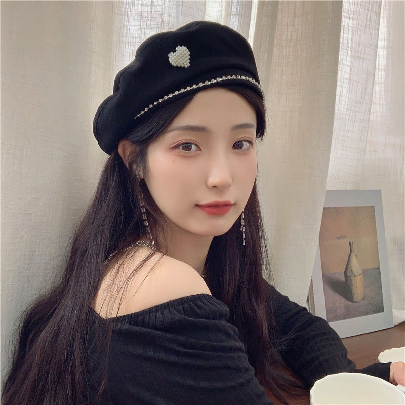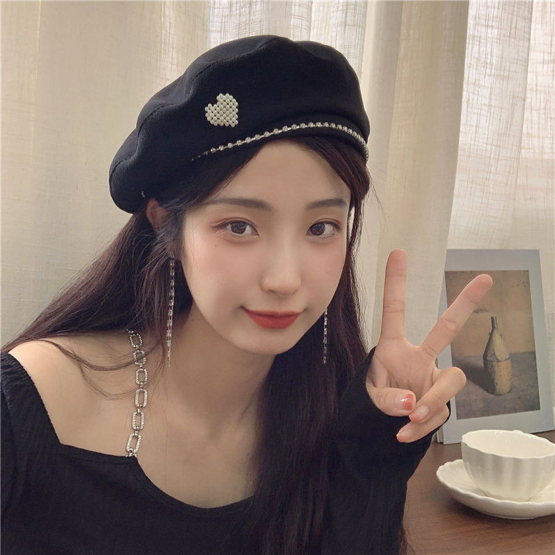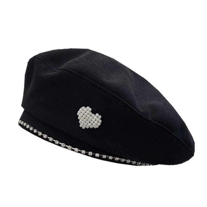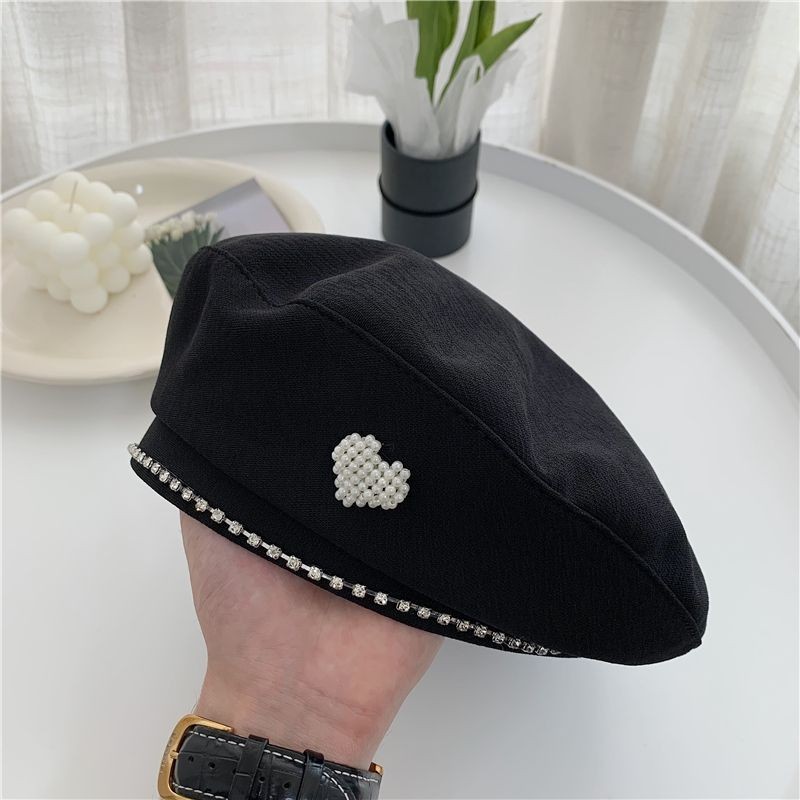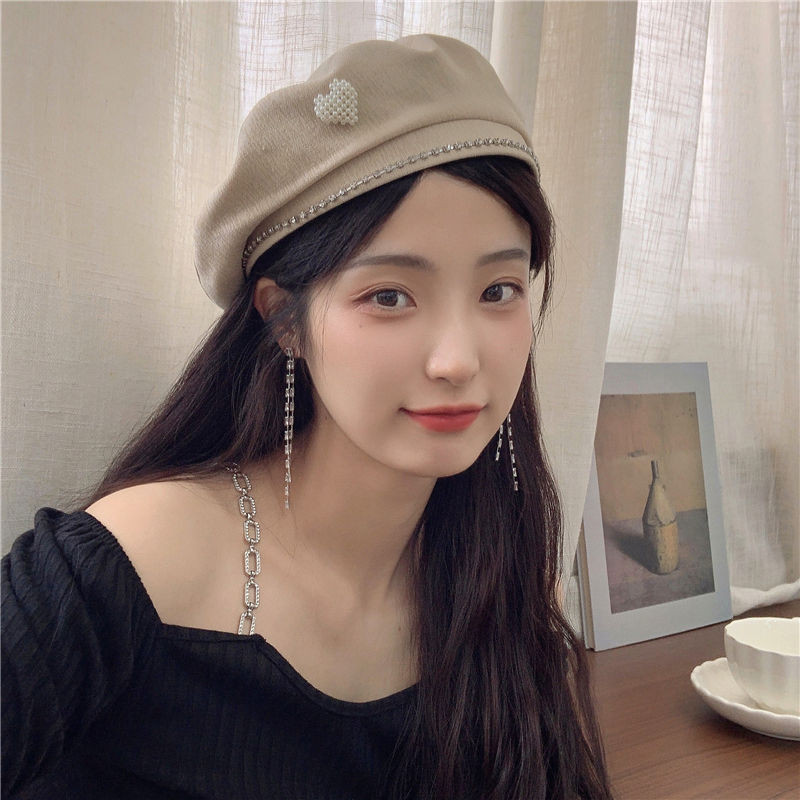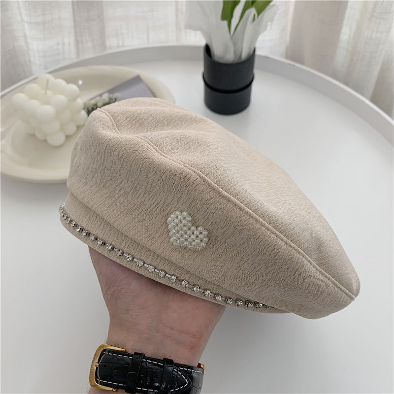 Baret Berlian Imitasi Mutiara Hati Wanita, Topi Pelukis Vintage Atasan Datar Elegan Jepang Untuk