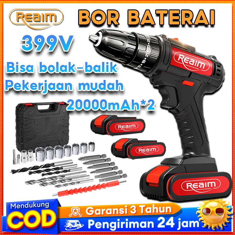 Reaim 2in1 Mesin Bor Baterai 399V Bor Listrik Tanpa kabel Mesin Cordless Screwdriver Impact Cordless