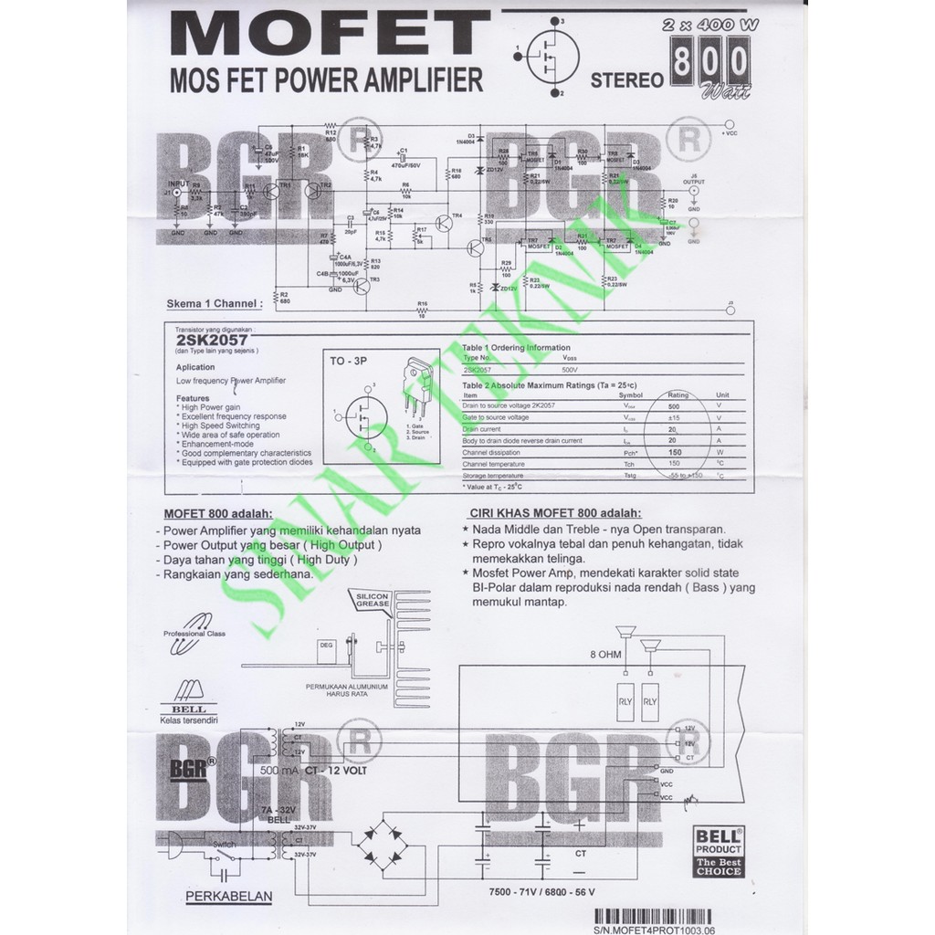 Kit PA. Mosfet 2x400W Bell ( 800W RMS ) Power Ampli Amplifier Mofet 2x400 800 Watt Stereo Elco Dioda Transistor Toshiba