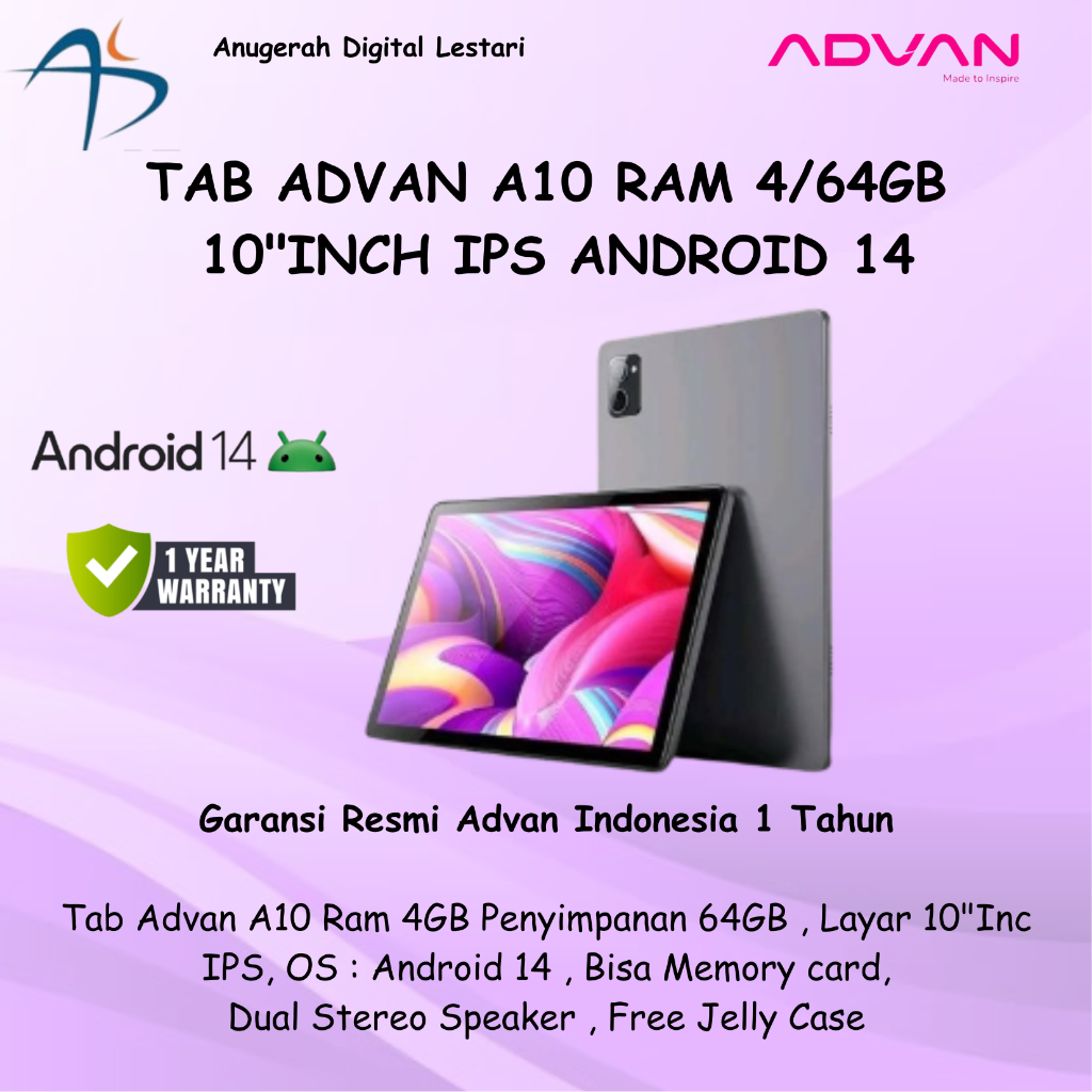 ADVAN TAB A10 RAM 4GB/64GB 10.1”IPS Screen Tablet Android 14 Free Jelly Case