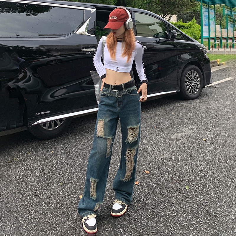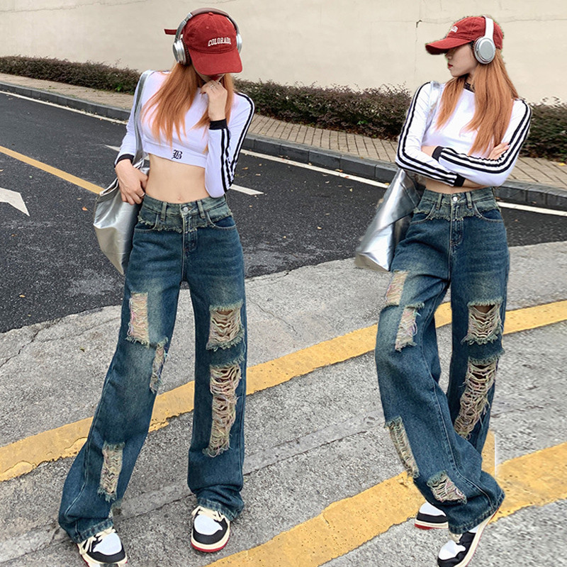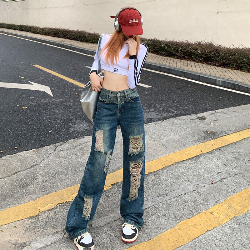 S5XL Celana Jeans Robek Pinggang Tinggi Retro Wanita Korea Gaya Terbaru Jeans Lurus Longgar Kasual
