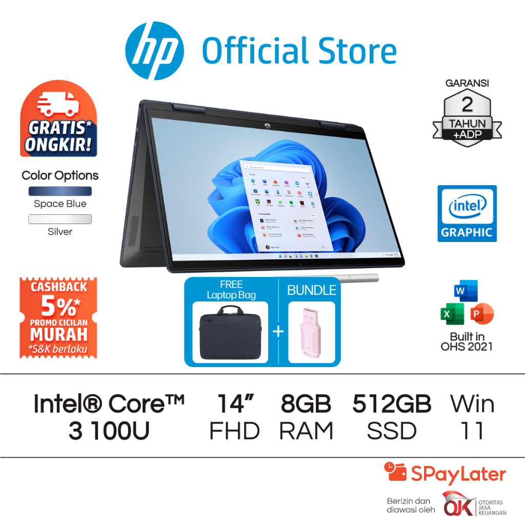 Laptop HP Pavilion x360 2 in 1 Intel Core 3 Intel Graphics 8GB RAM 512GB SSD Blue / Silver Windows 11 Home 14 Inch Garansi 2 Tahun Promo Murah Gratis Ongkir Official Non Second