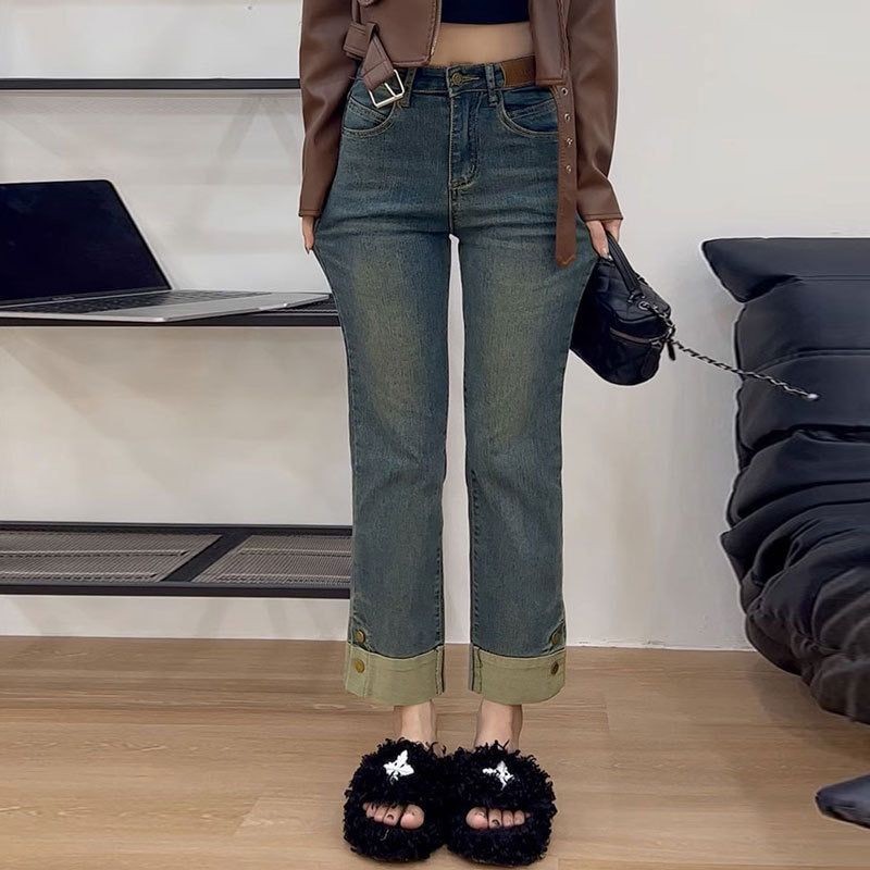 MFM 8034 Celana Jeans High Waist Jeans Kulot Highwaist Stretch Denim Kaki Lipat Jeans Variasi Kancing Panjang 7/8 Biru Retro Jeans Melar Nyaman