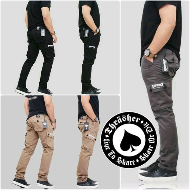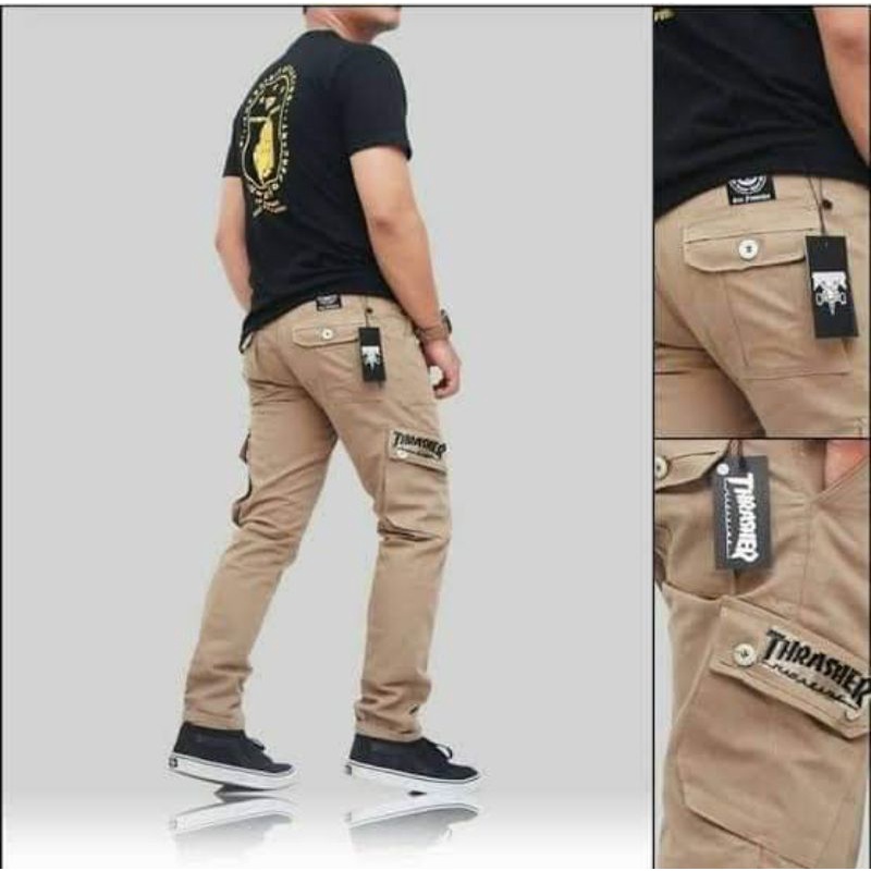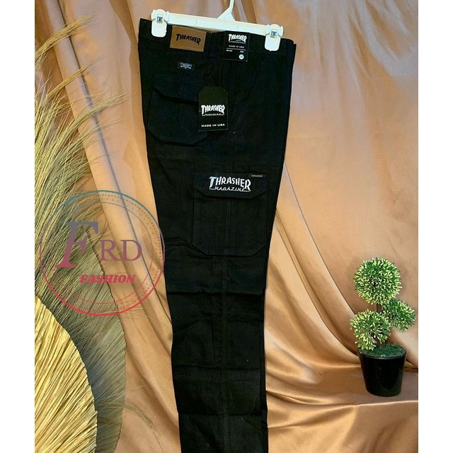 Celana Cargo Panjang Pria Thrasher Bahan Katun Tebal Nyaman Di Pakai Kimpul Banyak Kantong Size Jumbo 28-38