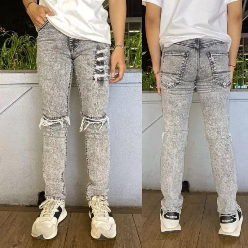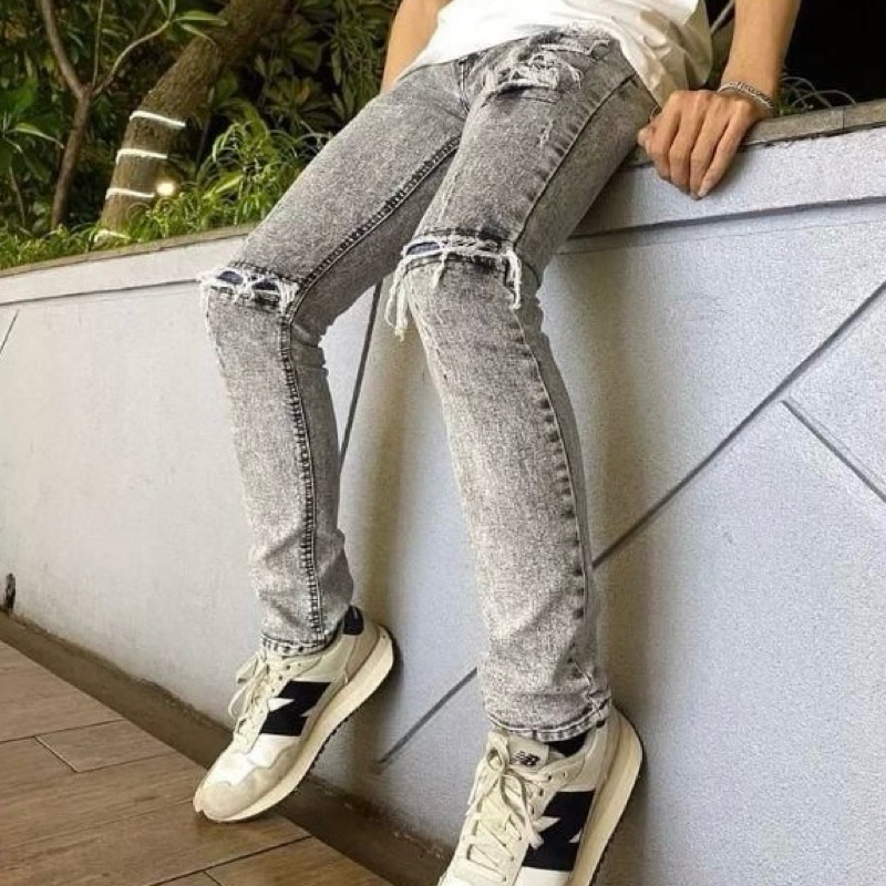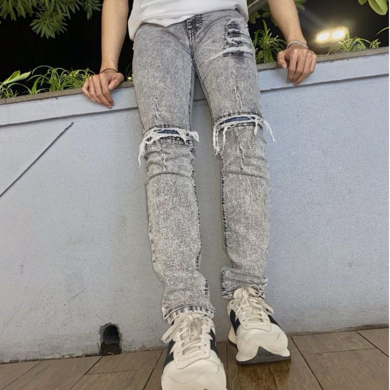 Celana Jeans Sobek Lutut Robek Ripped Hitam Abu Wash Denim Premium
