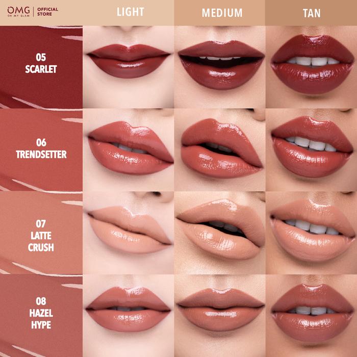01 Perfect Match, 02 FYP Pink , 03 Diva , 04 Gloss Boss , 05 Scarlet, 06 Trendsetter , 07 Latte Crush , 08 Hazel Hype