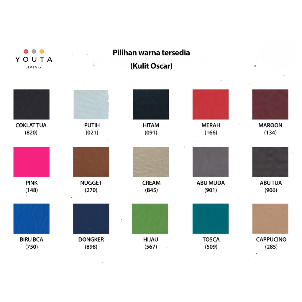 Coklat Tua (820), Putih (021), Hitam (091), Merah (166), Maroon (134), Pink (148), Nugget (270), Cream (B45), Abu Muda (901), Abu Tua (906), Biru BCA (750), Dongker (898), Cappucino (285), Warna Lainnya