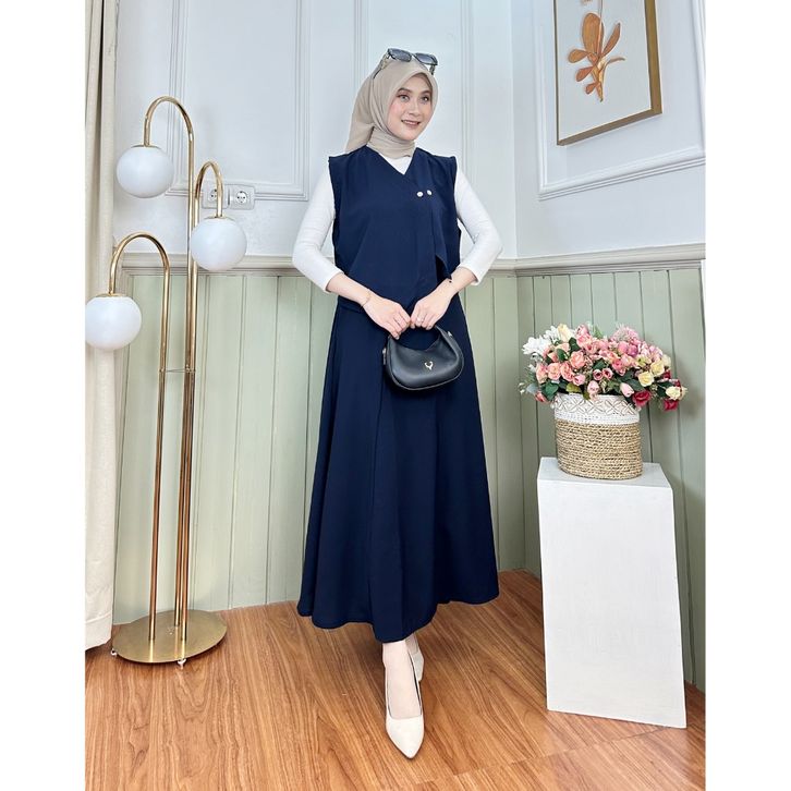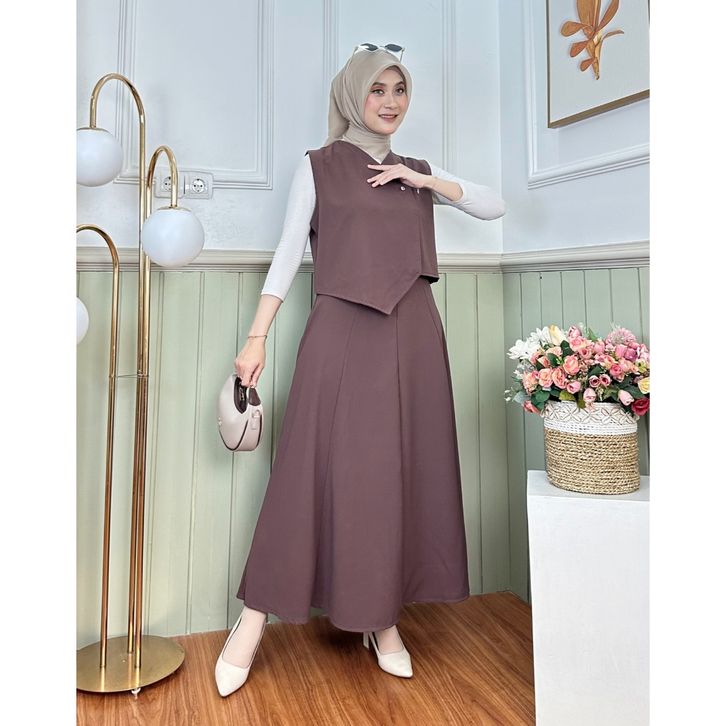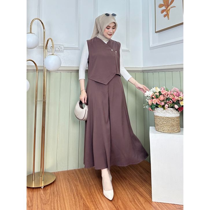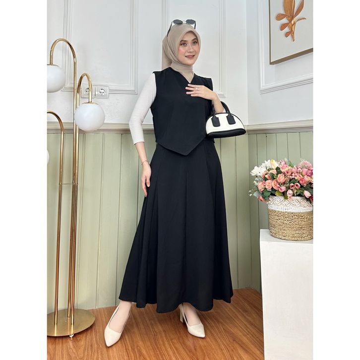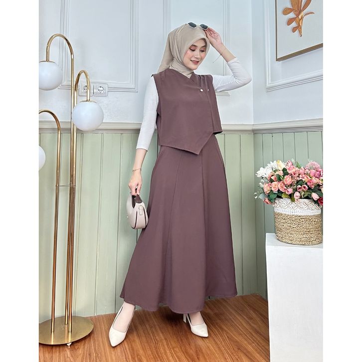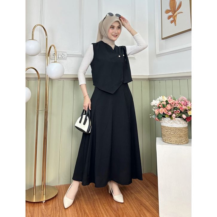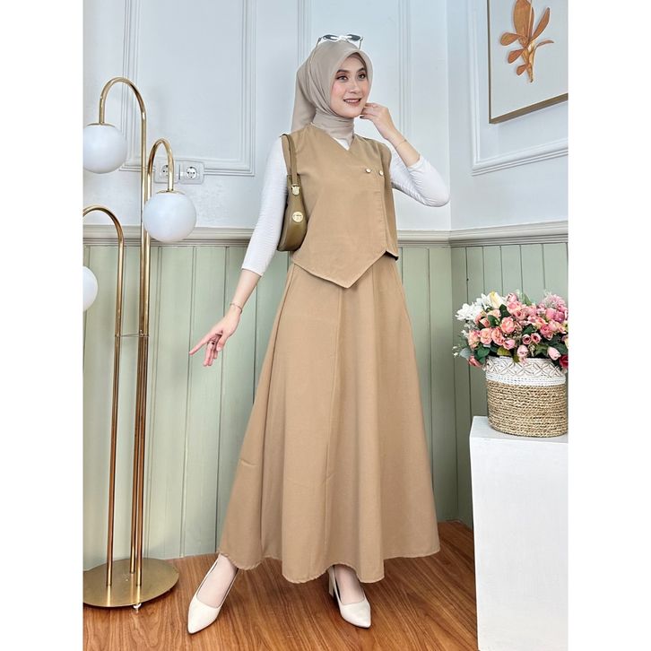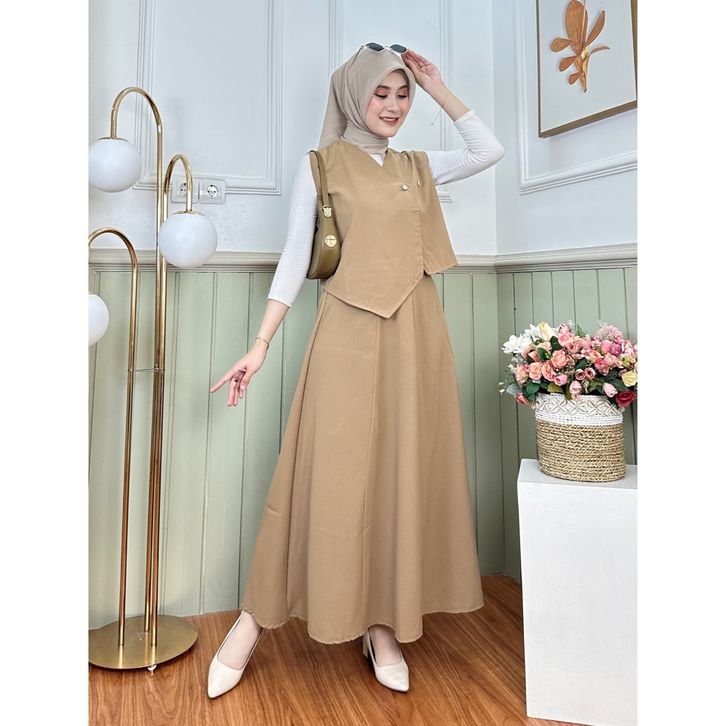 One Set Baju Setelan Rok Plus Rompi Outer Buasana Muslim Wanita Size S-M L-XL Casual Outfit