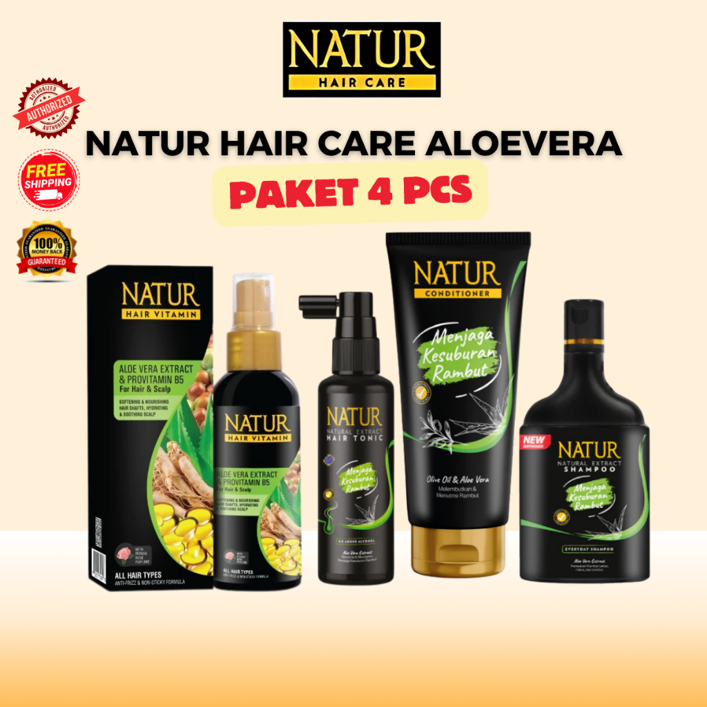 Natur Hair Care Paket Set 4in1 Aloevera (Shampoo, Conditioner, Hair Tonic, Serum & Vitamin Rambut)