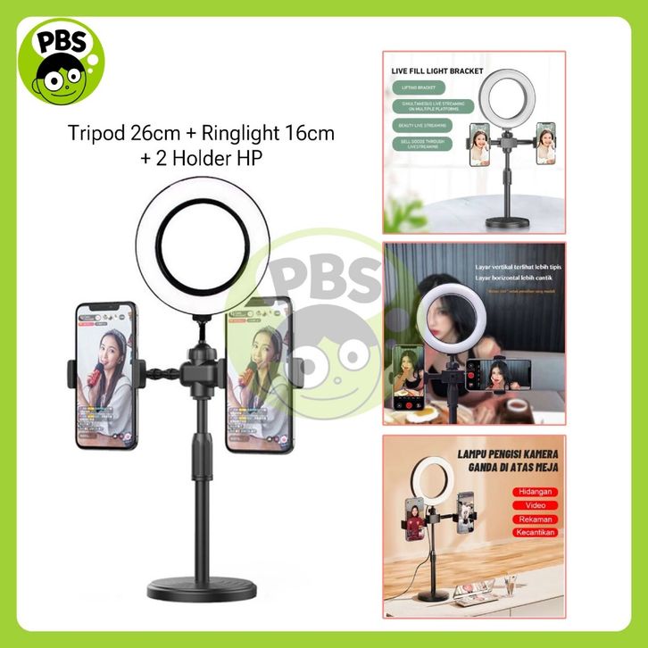TERMURAH PBS - Paket Ringlight 16cm + Tripod Mini Stand 28cm + 2 Holder HP Live Streaming Make Up Vlog ugekl