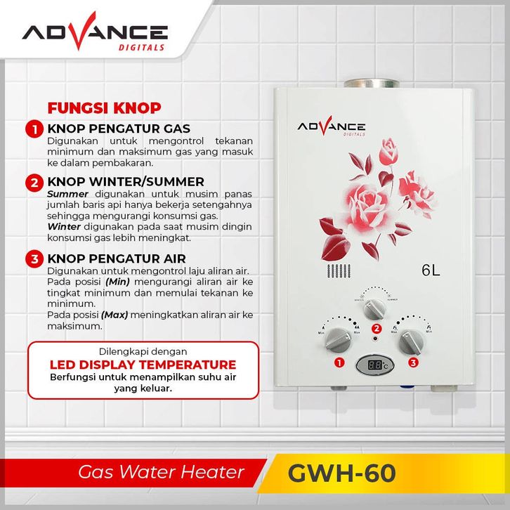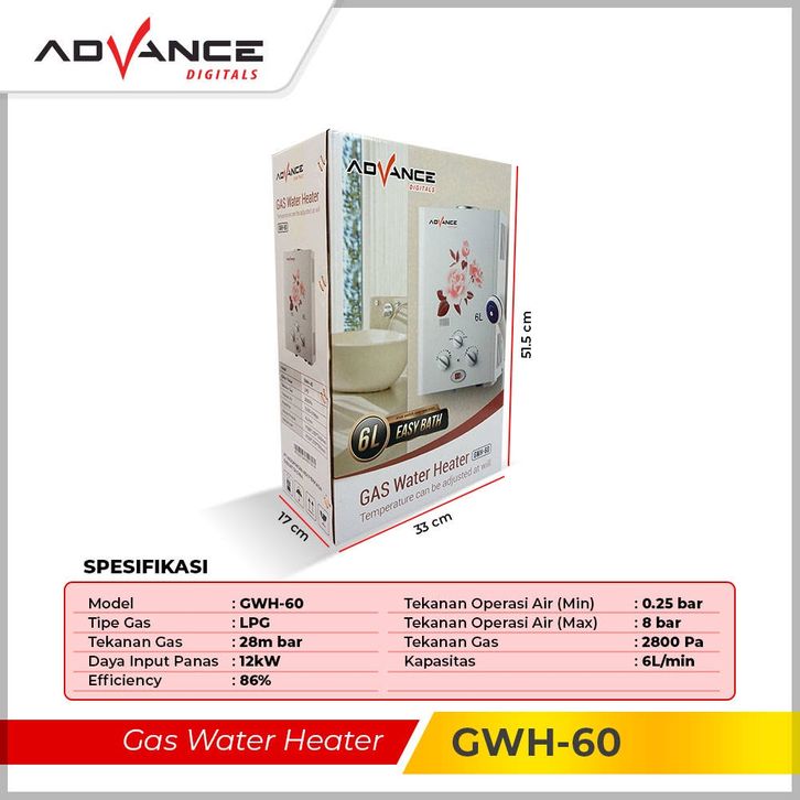 TERLARIS 【Garansi 1 Tahun】ADVANCE Water Heater Pemanas Air Gas 6L Pemanas Air Kamar Mandi agebmn