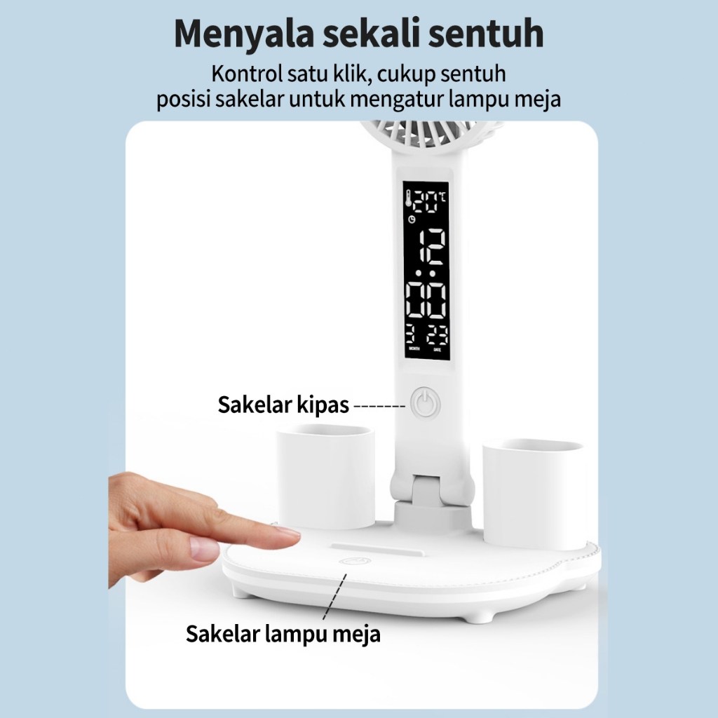 CELOGLO READY GARANSI 3 TAHUN LAMPU MEJA MULTIFUNGSI 3IN1 LED LIPAT EMPAT KEPALA DENGAN KIPAS JAM KALENDER LAMPU MEJA USB ISI ULANG LAMPU BACA 3 WARNA
