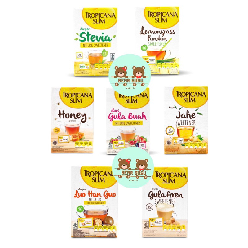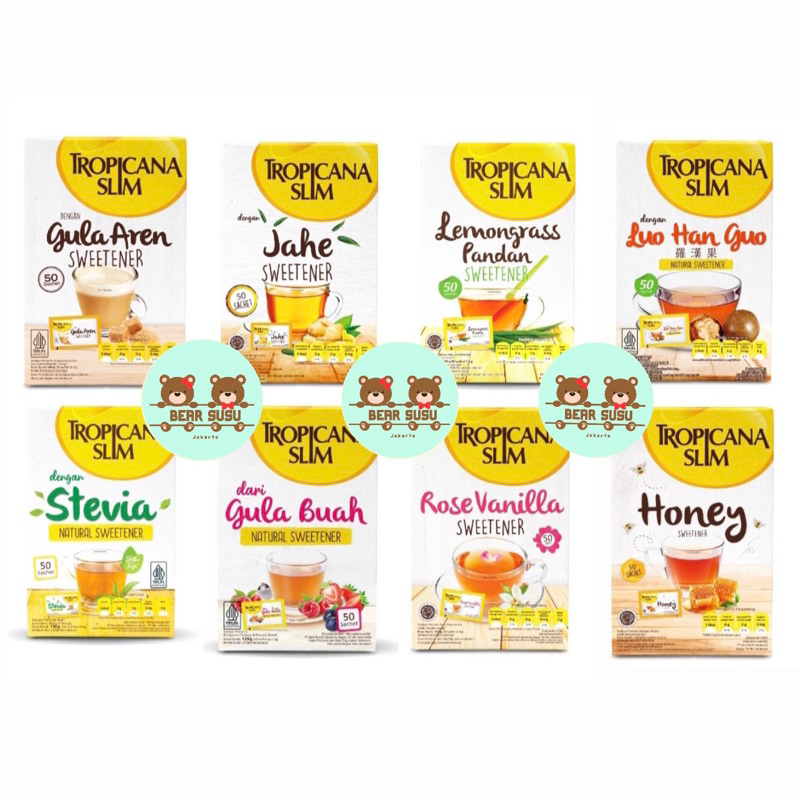 TROPICANA SLIM SWEETENER STEVIA / LEMONGRASS PANDAN / HONEY / GULA BUAH / JAHE / LUO HAN GUO / GULA AREN 50 SACHET