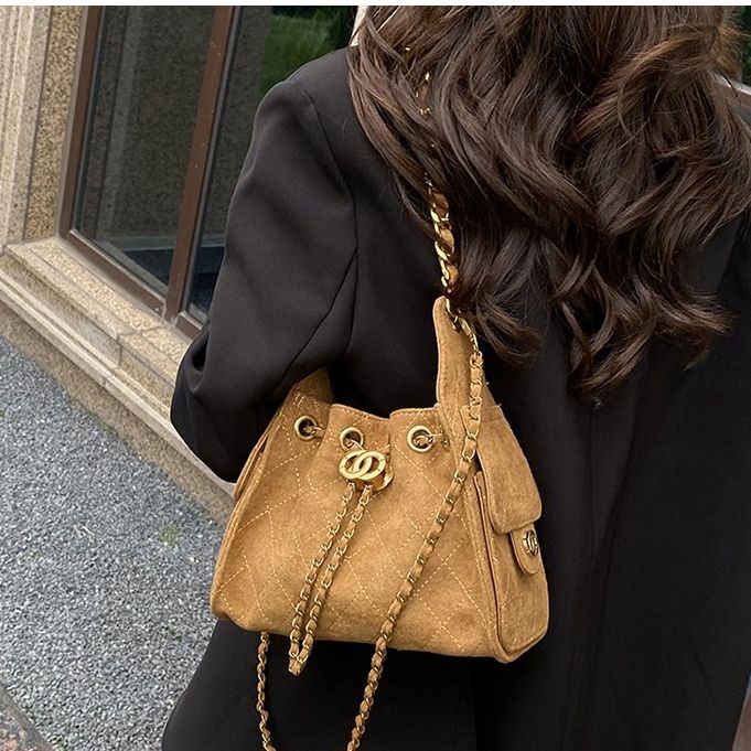 Tas bahu tali serut dengan motif rhombus rantai, tas ember wanita Tas dan Penyimpanan