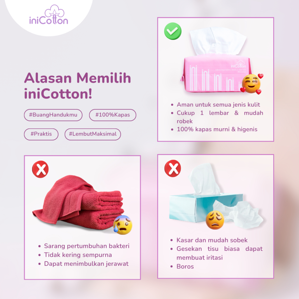 (3 Bungkus) iniCotton Tisu Wajah 100 PERSEN Cotton, Tisu Lembut Sekali Pakai, Kering & Basah, 90 lembar