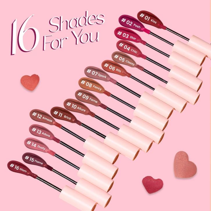 01 kiss, 02 posh, 03 star, 04 chic, 05 classy, 06 ritz, 07 spark, 08 fancy, 09 fame, 10 allure, 11 brick, 12 amaze, 13 adore, 14 dusty, 15 flame, 16 glam, boba 01 forest berry, boba 02 brown sugar, boba 03 salt caramel, boba 04 pink lava, boba 05 creamy peach, boba 06 hazelnut lat
