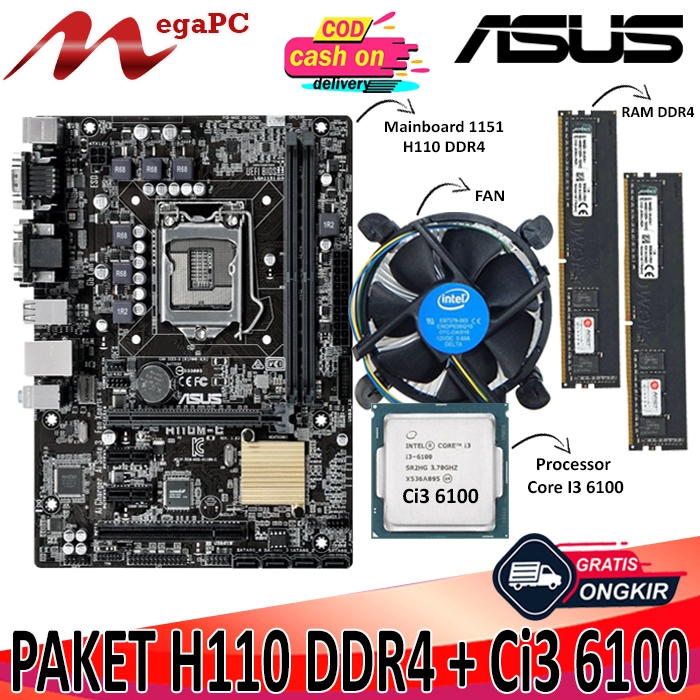 Paket Motherboard Mobo LGA 1151 H110 DDR4 + Core i3 6100 + FAN + RAM