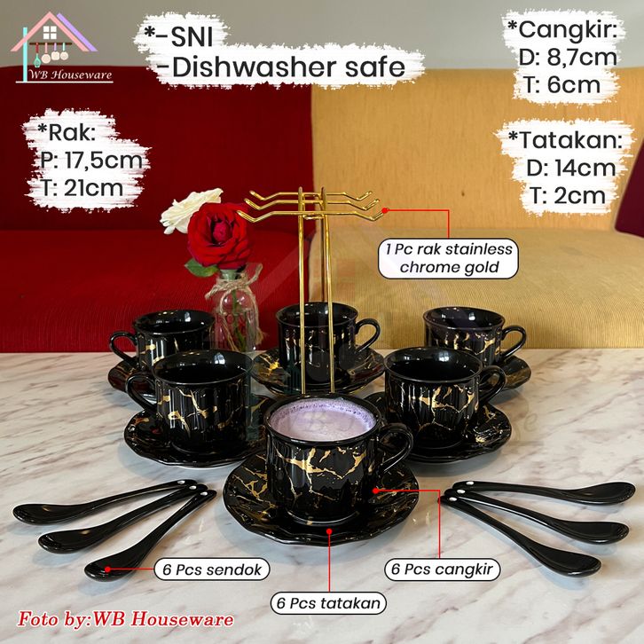 RK - FIORENZA 6 pasang cangkir set + sendok + rak series duluxe blackmarble 220ml / tea set coffee cup and saucer ceram