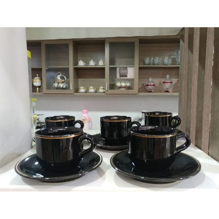 RK - Set Cangkir - Cangkir Keramik dan Lepek Kopi Teh Hitam Putih List mas Lucky