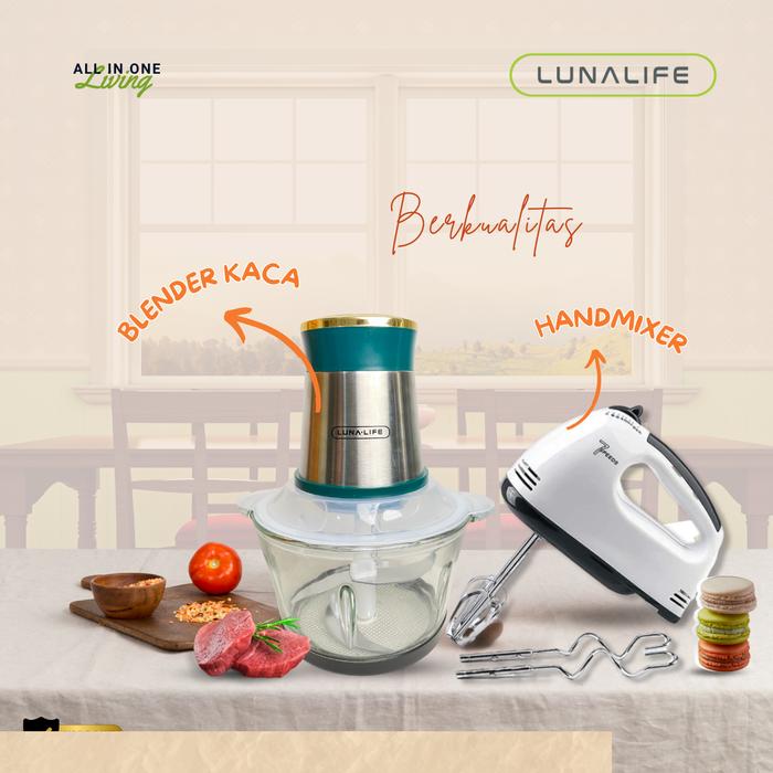 [Steven.stenlyy Exclusive] LUNALIFE Paket Food Chopper Kaca 2L + Hand Mixer 7 Kecepatan 2 Tongkat