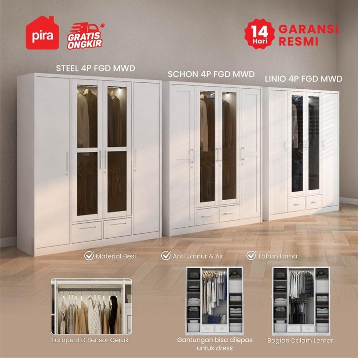 PIRA - LINIO 4P FGD MWD Lemari Pakaian Besi 4 Pintu dengan Laci dan LED