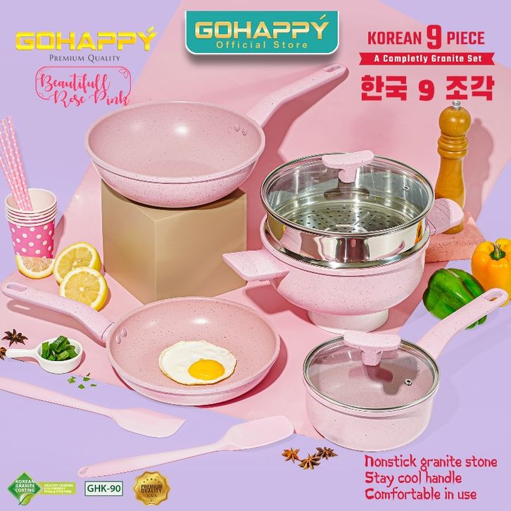 panci set lengkap PANCI SET KOREA GOHAPPY ISI 9 PCS / Cookware set 9pc Marble9ranite pastel anti lengket likespt steinc