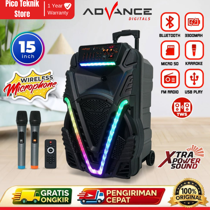 Speaker Bluetooth Advance karaoke portable+2xmic Wireless TWS 15inch 1207/1507 Gratis Ongkir