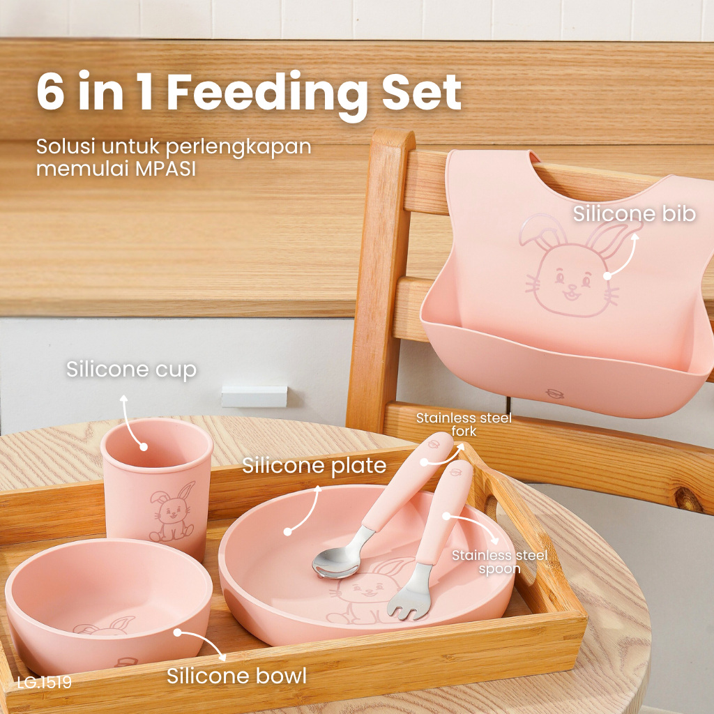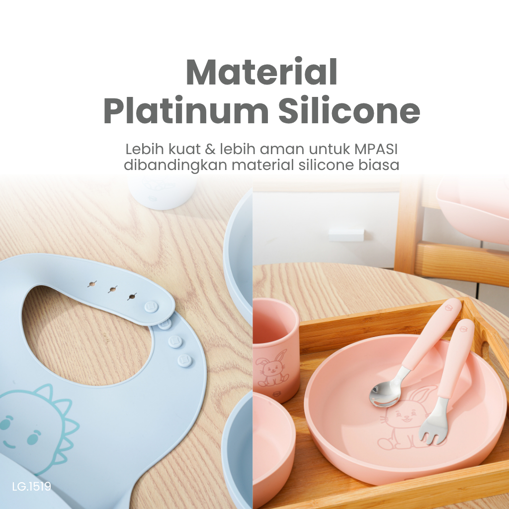 Little Giant 6 IN 1 PLATINUM SILICONE FEEDING SET | Gift Set Silicone Bib Piring Gelas Sendok Garpu Stainless MPASI | Si