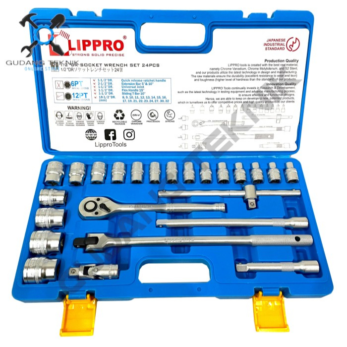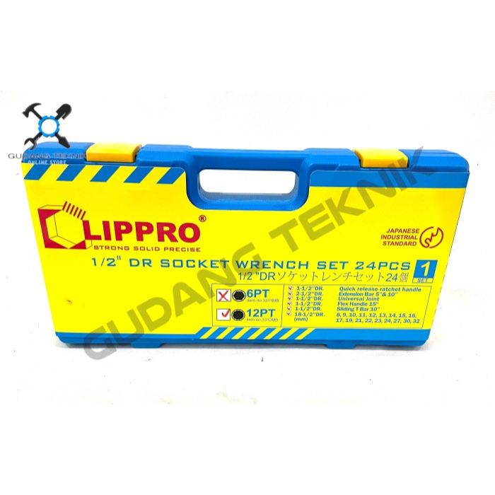 Kunci Shock 1/2" 1 Set 24pcs 8-32mm 6PT 3311MB 12PT 3312MB LIPPRO / Socket Wrench Chrome Kunci Sok Sock 1/2 Inch 24 Pcs