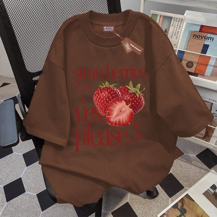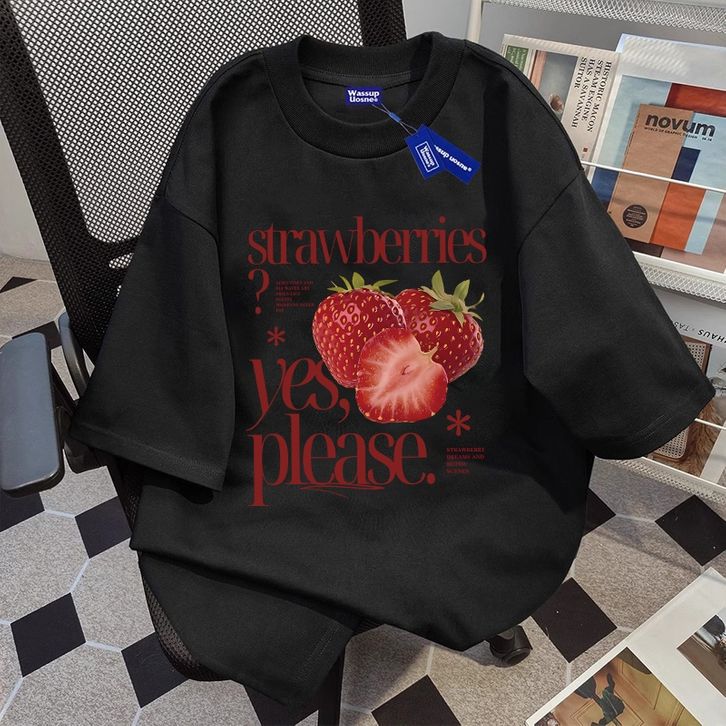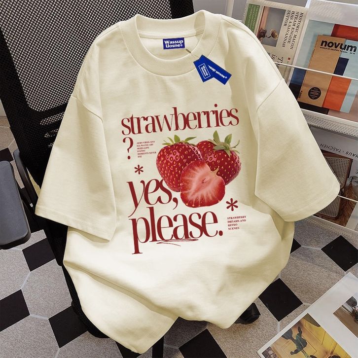 BOOMBAP Korean Style T-shirt Oversize Please eat strawberry Print top| Kaos Wanita Cream | Kaos pria dan wanita