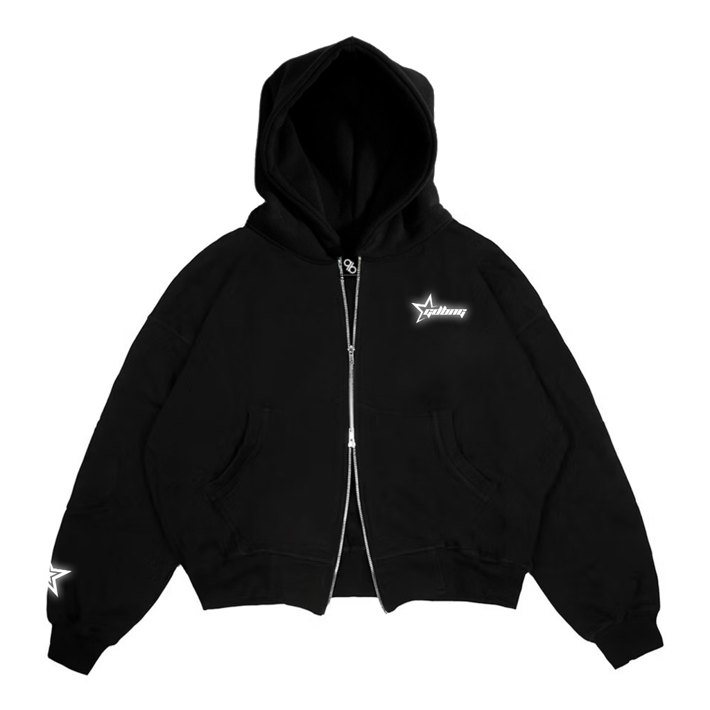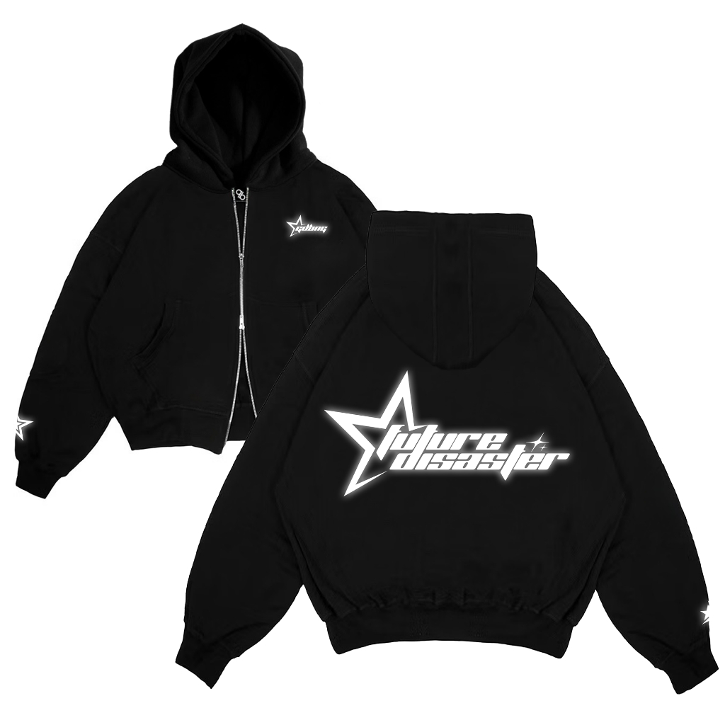 Gadabang Hoodie Boxy Double Zipper Menyala Sablon Reflective Future Disaster Hitam