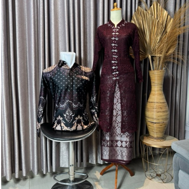 AYWEARS - SET PASANGAN KEBAYA MALIKA BURGUNDY DAN KEMEJA BATIK LENGAN PANJANG