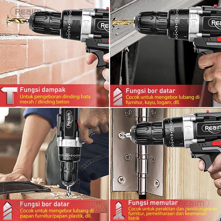REAIM 2 Baterai Impact Cordless Drill Mesin Bor Untuk Tembok Beton Mesin Baterai- Bor Listrik Set