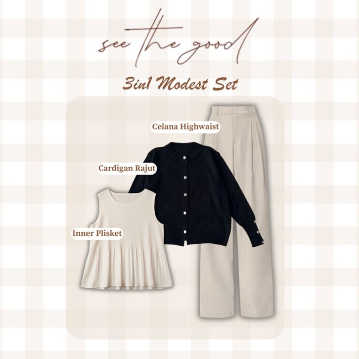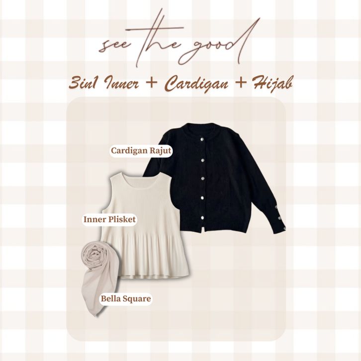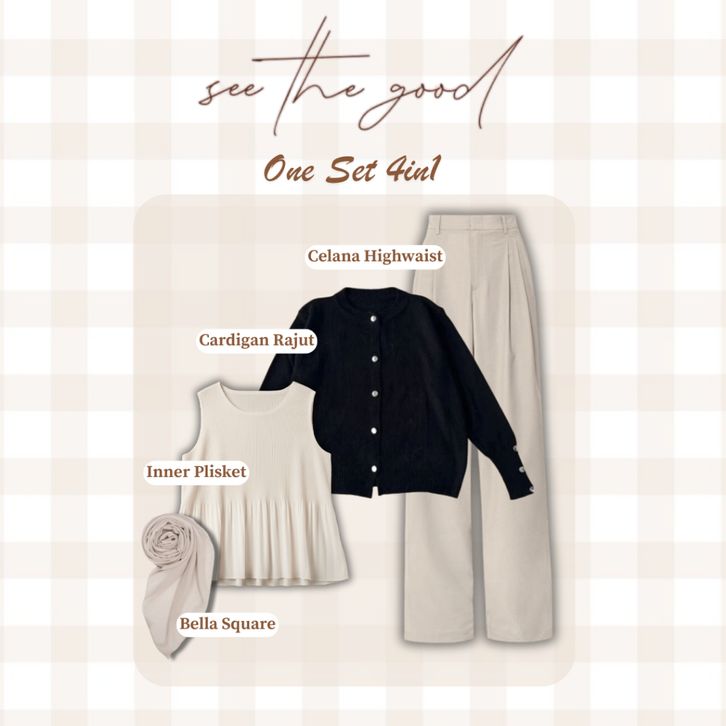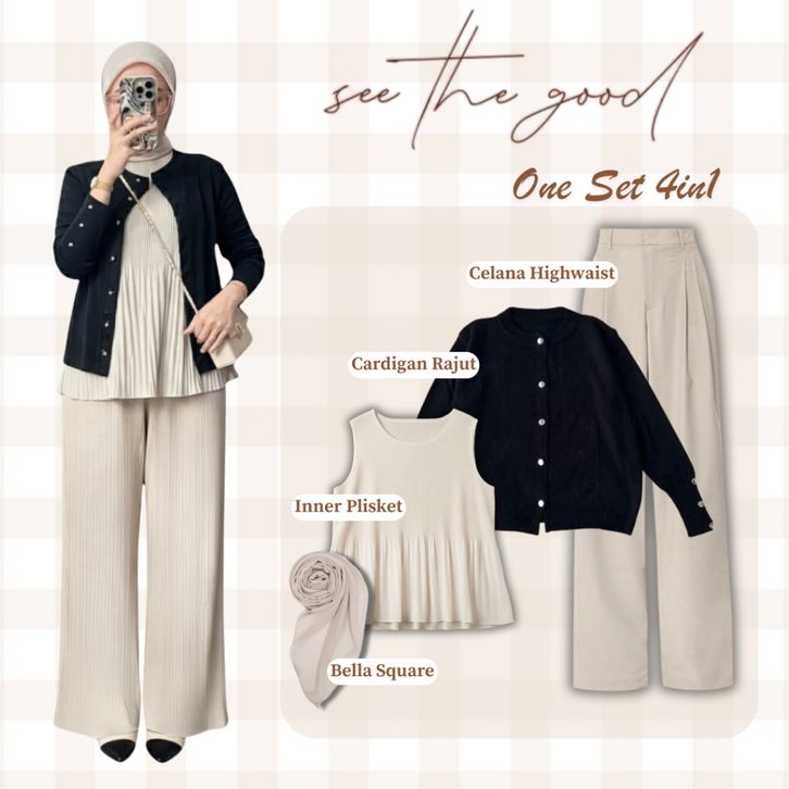 Setelan Baju Wanita Dewasa Kekinian Ootd 4in1 Oneset Cardigan Rajut + Celana Highwaist + Hijab Outfit Cewek Stylish