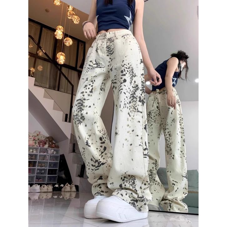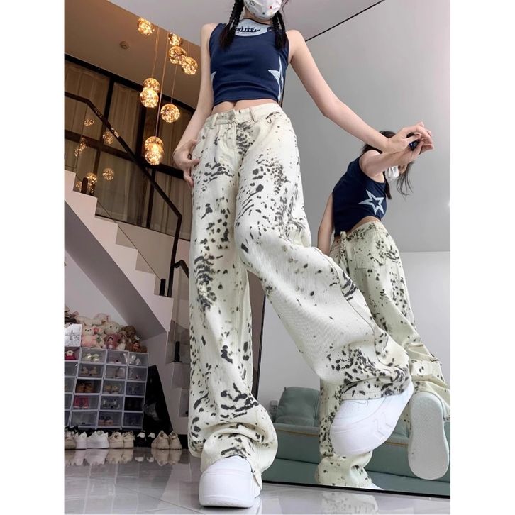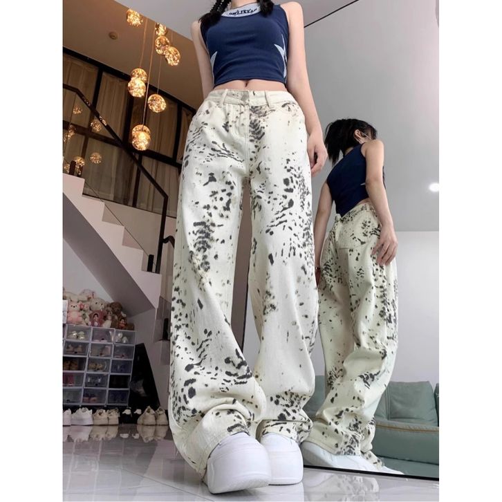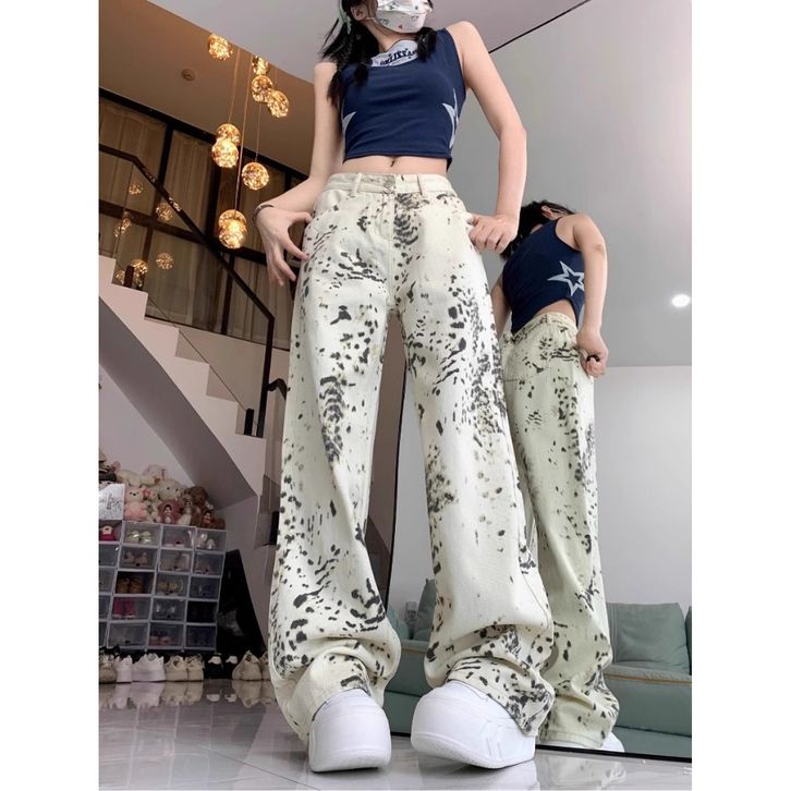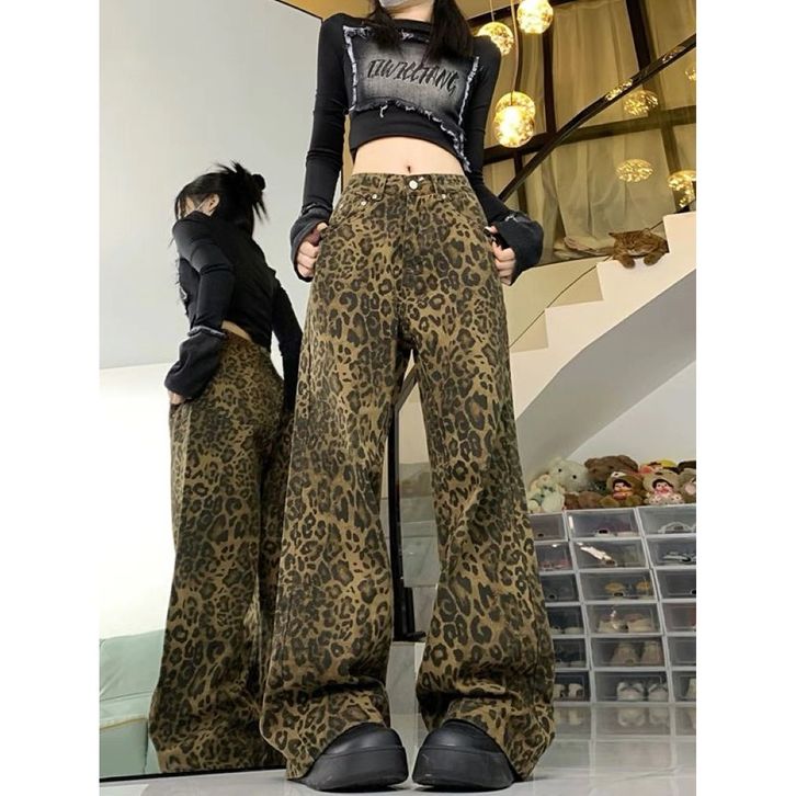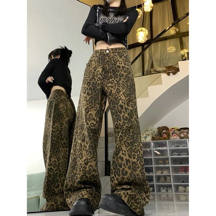 [Star] Celana Jeans Wanita New Street Style Leopard Print Loose Celana Wanita Hiigh Waist Wide-leg Keren Kekinian