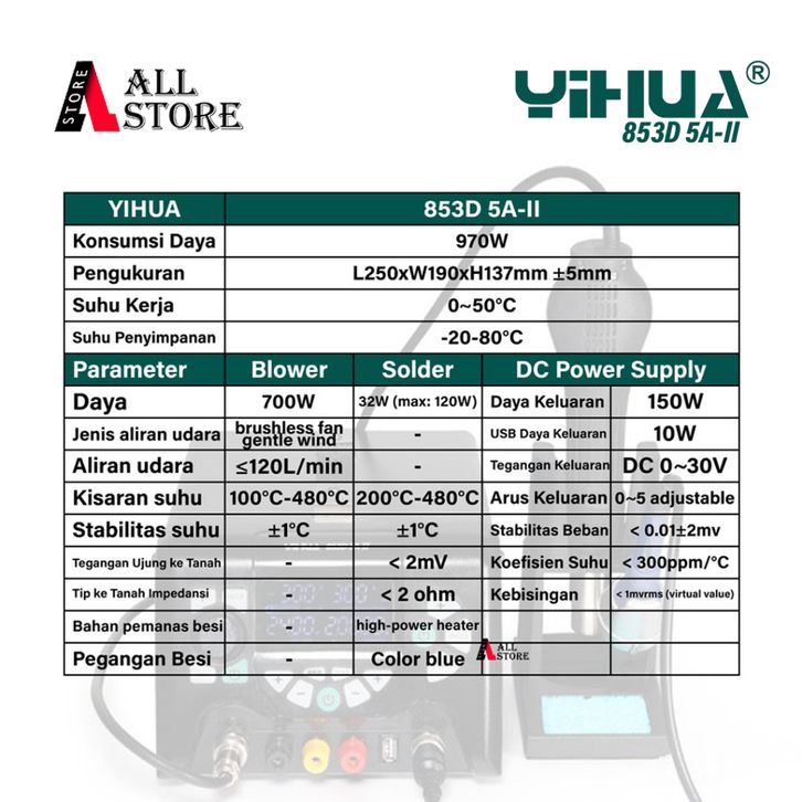 YIHUA 853D 5A II Blower Uap + Soldering +Power Supply Hp 5A 30V