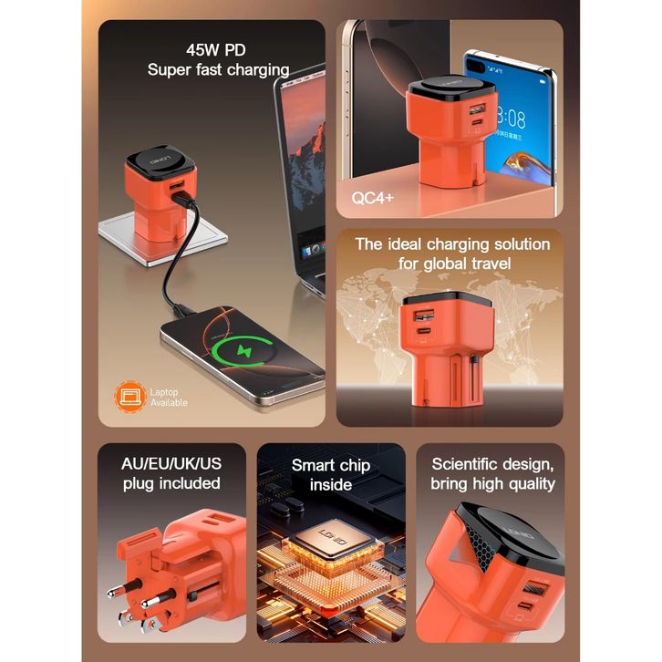NEW Arrival LDNIO Q2420 Universal Travel Adaptor Charger 45 Watt 1 USB-C 1 USB-A Plug US/UK/EU /AU All in one