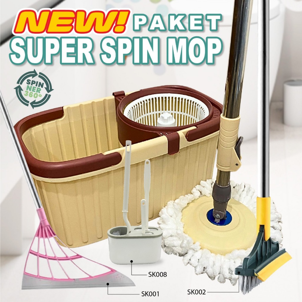 1 Set Paket Alat Pel Spin Mop dan Sikat 2in1 Kamar Mandi Mop Magic Spin Pel Lantai dengan Ember Plastik