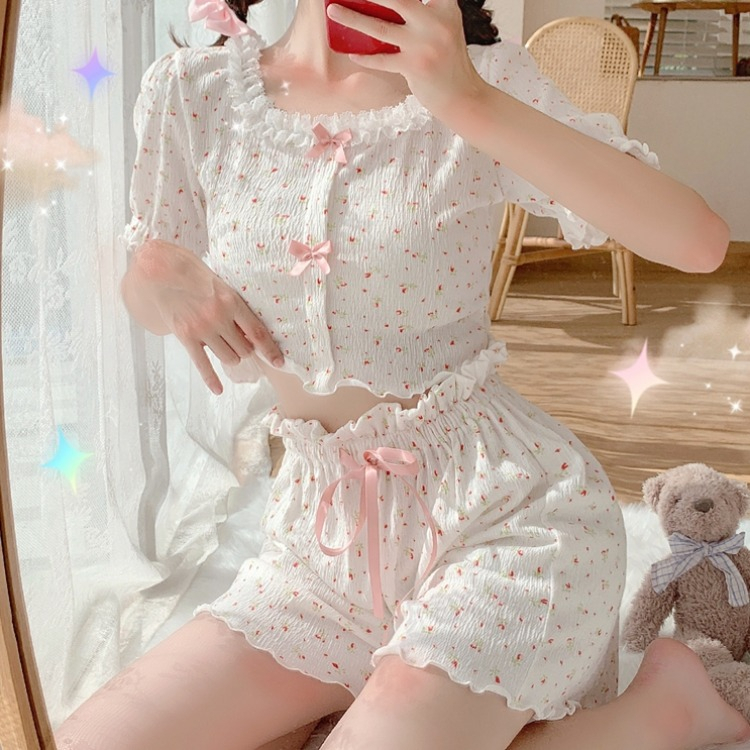 Piyama Sweet Stelan Import Baju Tidur Celana Pendek Putih Bunga Baju SPT