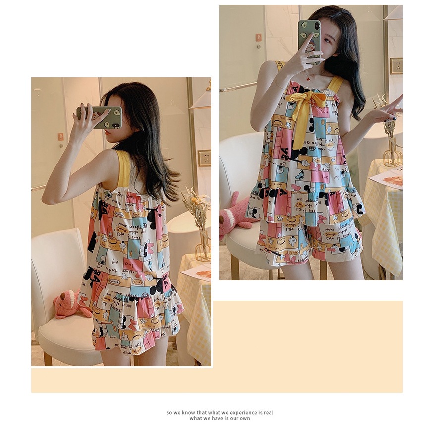 Setelan baju tidur wanita dewasa lengan kutung celana pendek bahan katun polyester adem licin serap keringat motif karak