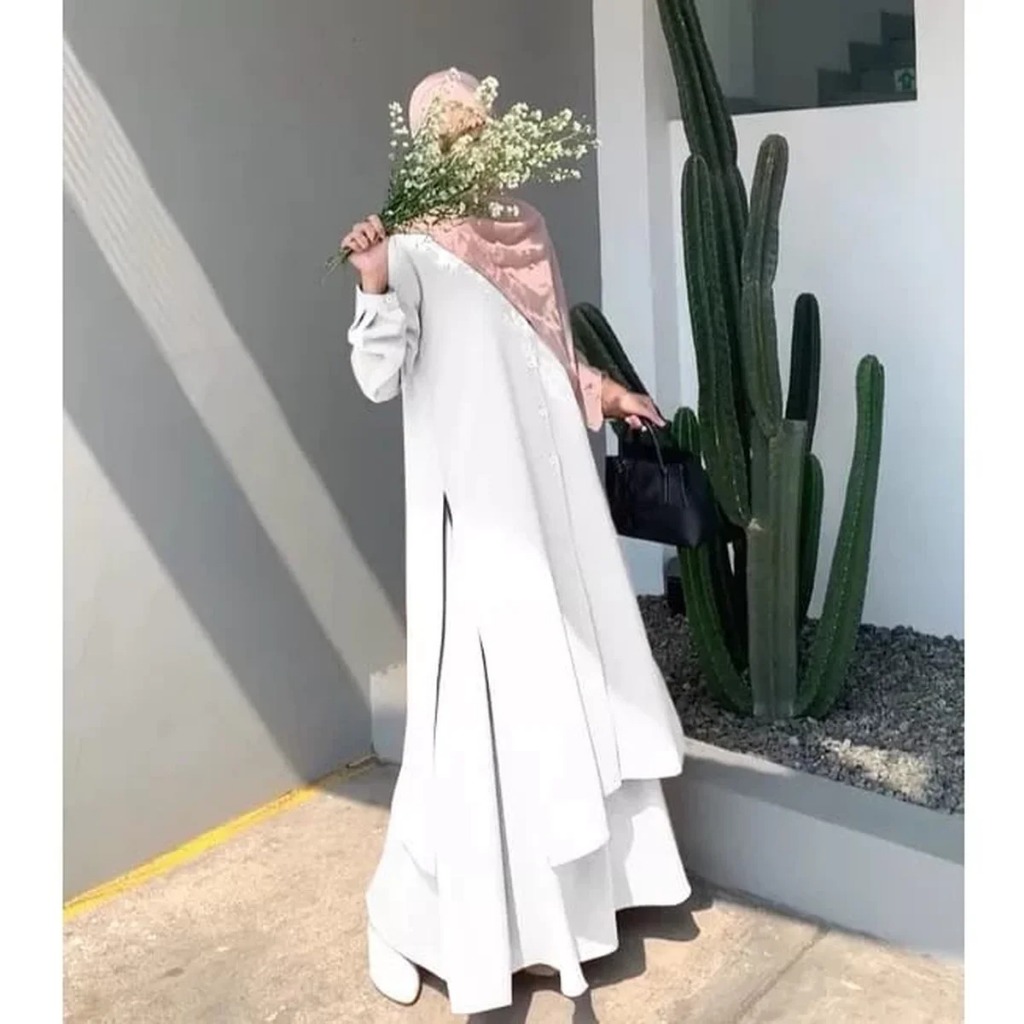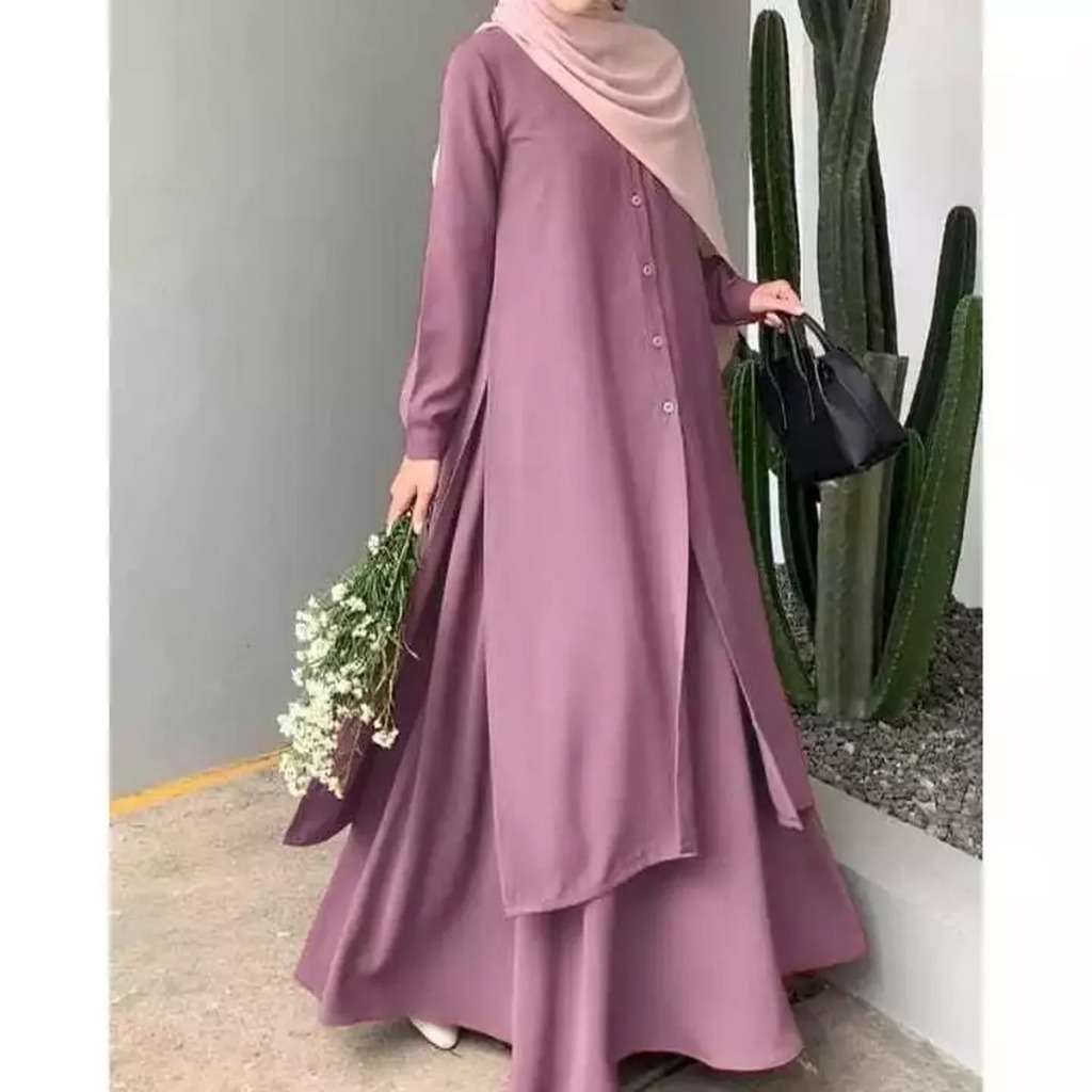 Vania One set Rok Long Tunik Syari Baju setelan Wanita Muslim Atasan Size Jumbo Bahan Ity Crepe Belah Samping Full Kanci