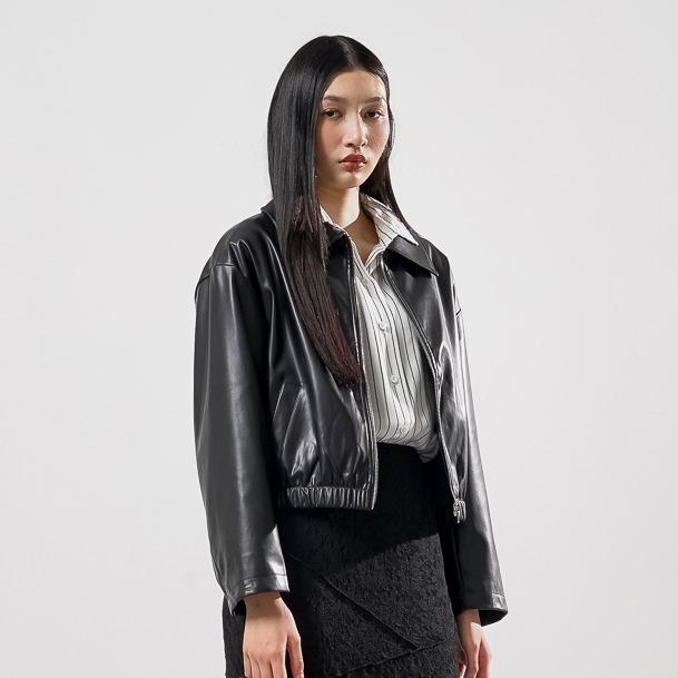 Enzy Storia X This Is April Es Jaket Crop Wanita Lengan Panjang Kasual Kekinian Svetlana Leather Atasan Casual - Black -
