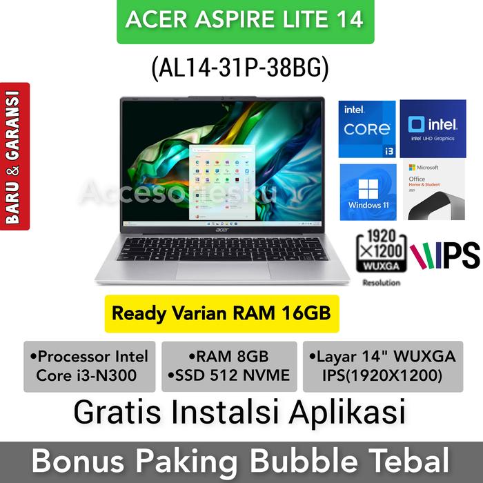 ACER ASPIRE LITE 14 AL14-31P CORE I3-N300 8GB 512GB 14" IPS WINDOWS LAPTOP RAM SSD SILVER - RAM 8GB
