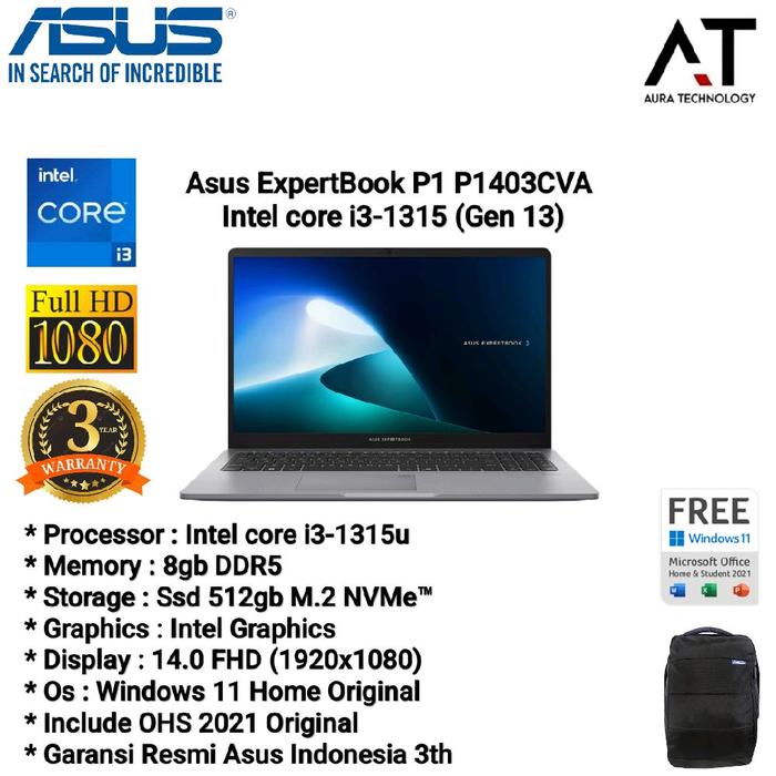ASUS EXPERTBOOK P1403CVA I3 1315U 8GB/16GB SSD 512GB UHD GRAPHICS 14" FHD WINDOWS 11 HOME + OHS RESMI 3 TAHUN - 8GB/SSD 512GB, WINDOWS 11 HOME